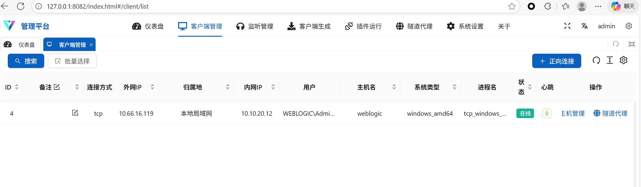 执行,通过进程或者网络连接来看是否启动监听,然后在通过vshell走代理看看能连接不