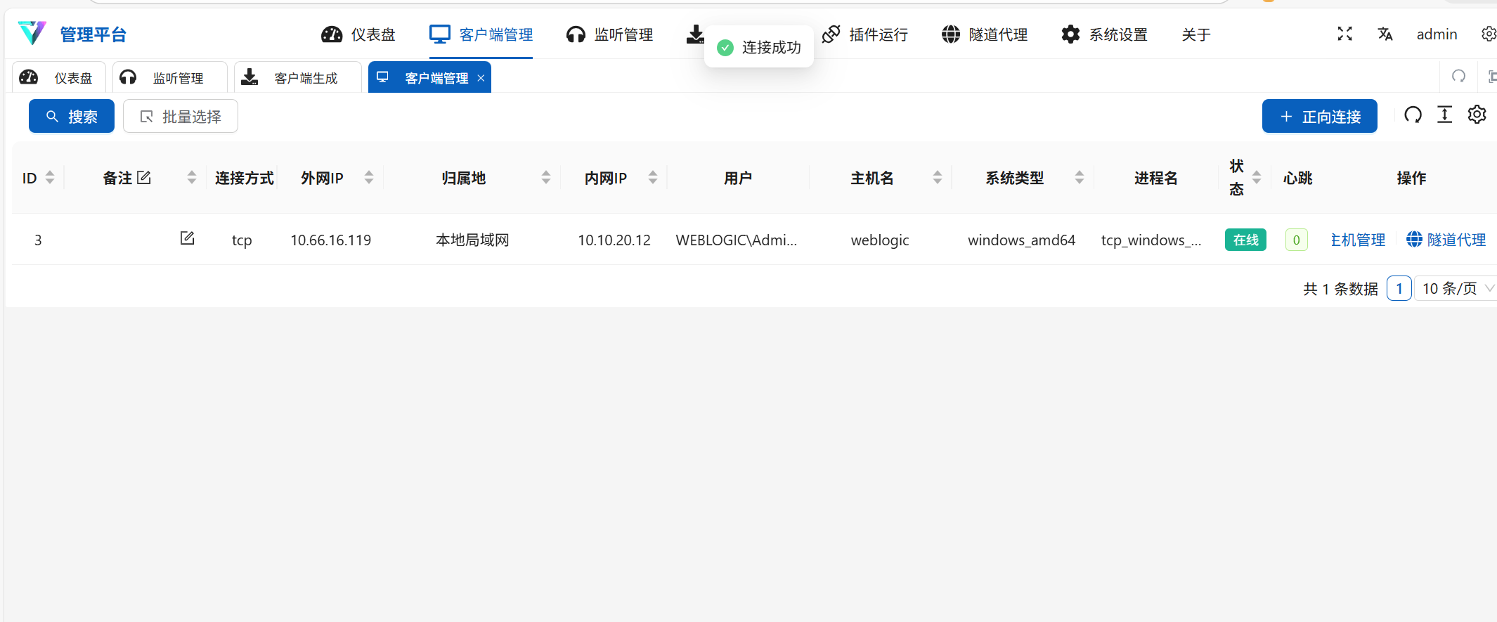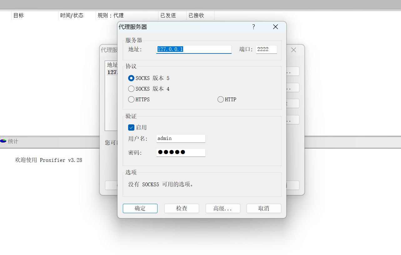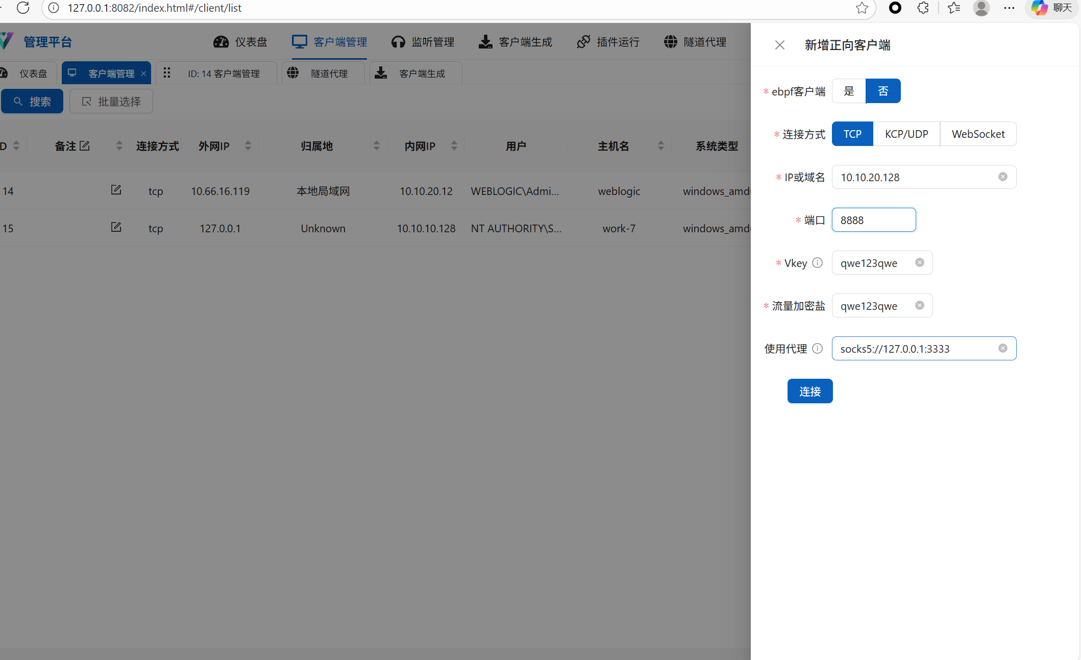 使用正向连接,但是使用的socks代理不可以使用账号和密码,否则连接不成功,应该是开发vshell工具的作者还有想到这一点,正向连接的代理不支持使用账号密码验证