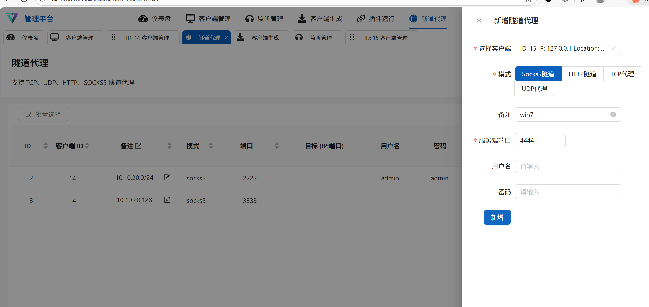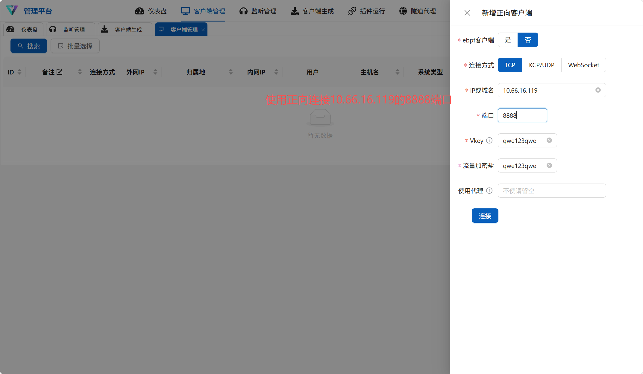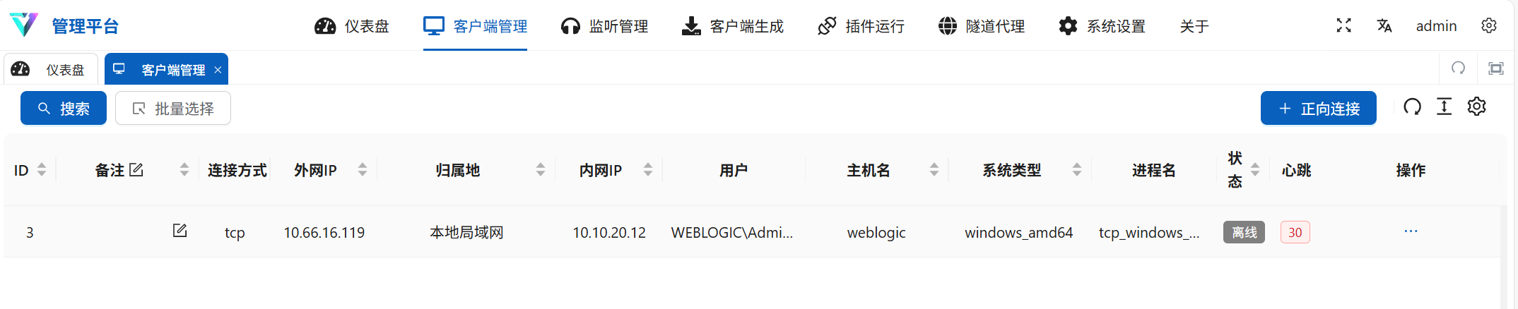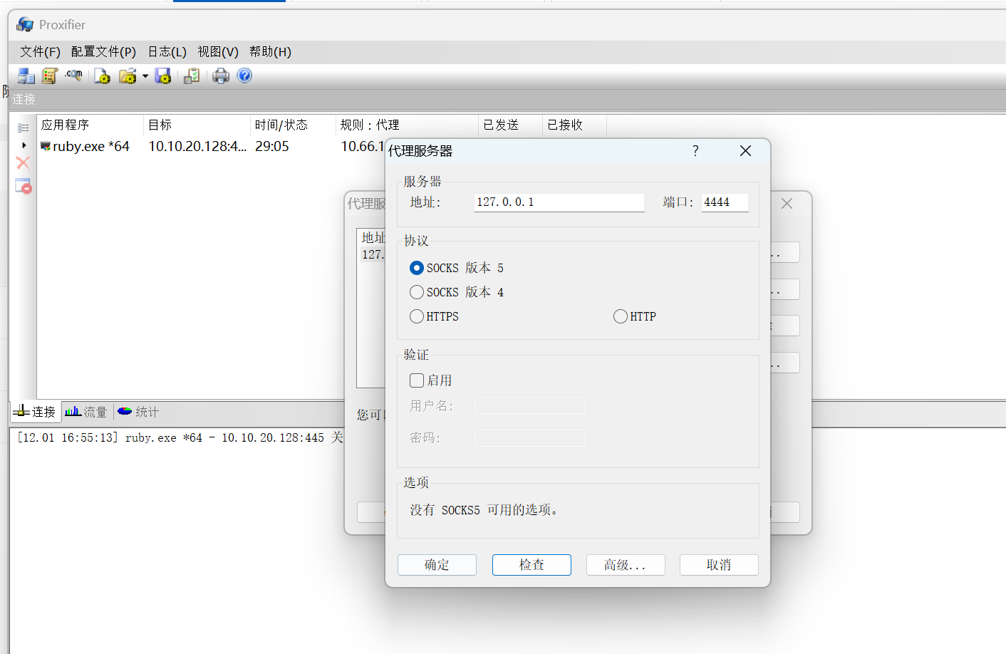 使用正向连接,但是使用的socks代理不可以使用账号和密码,否则连接不成功,应该是开发vshell工具的作者还有想到这一点,正向连接的代理不支持使用账号密码验证