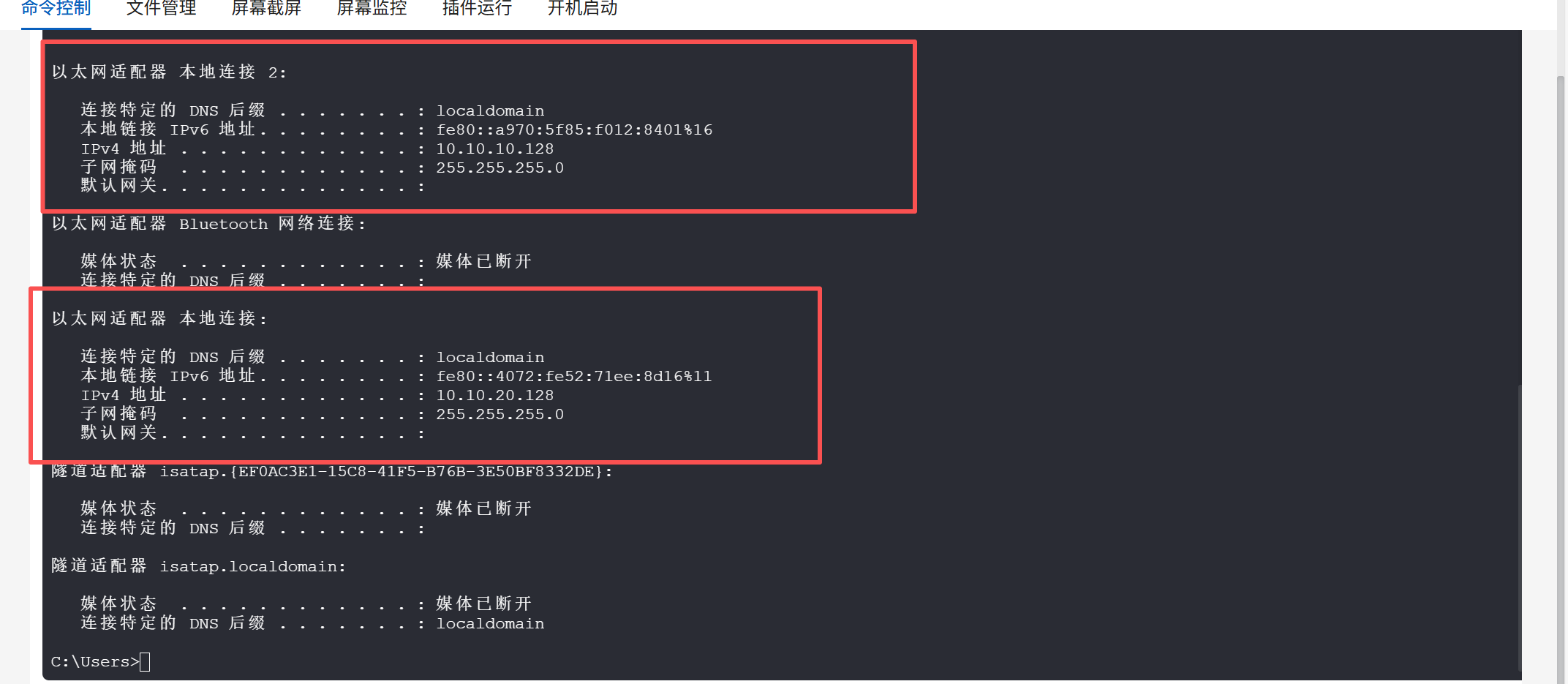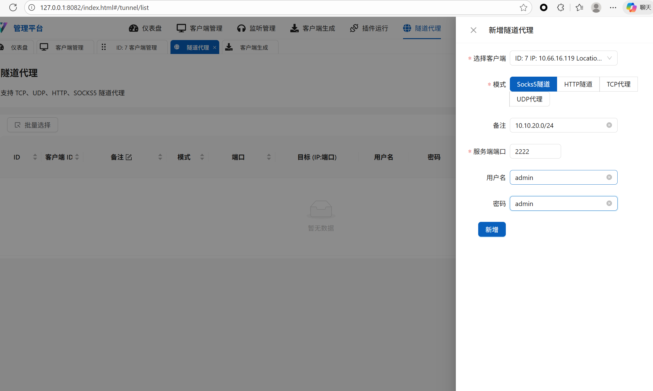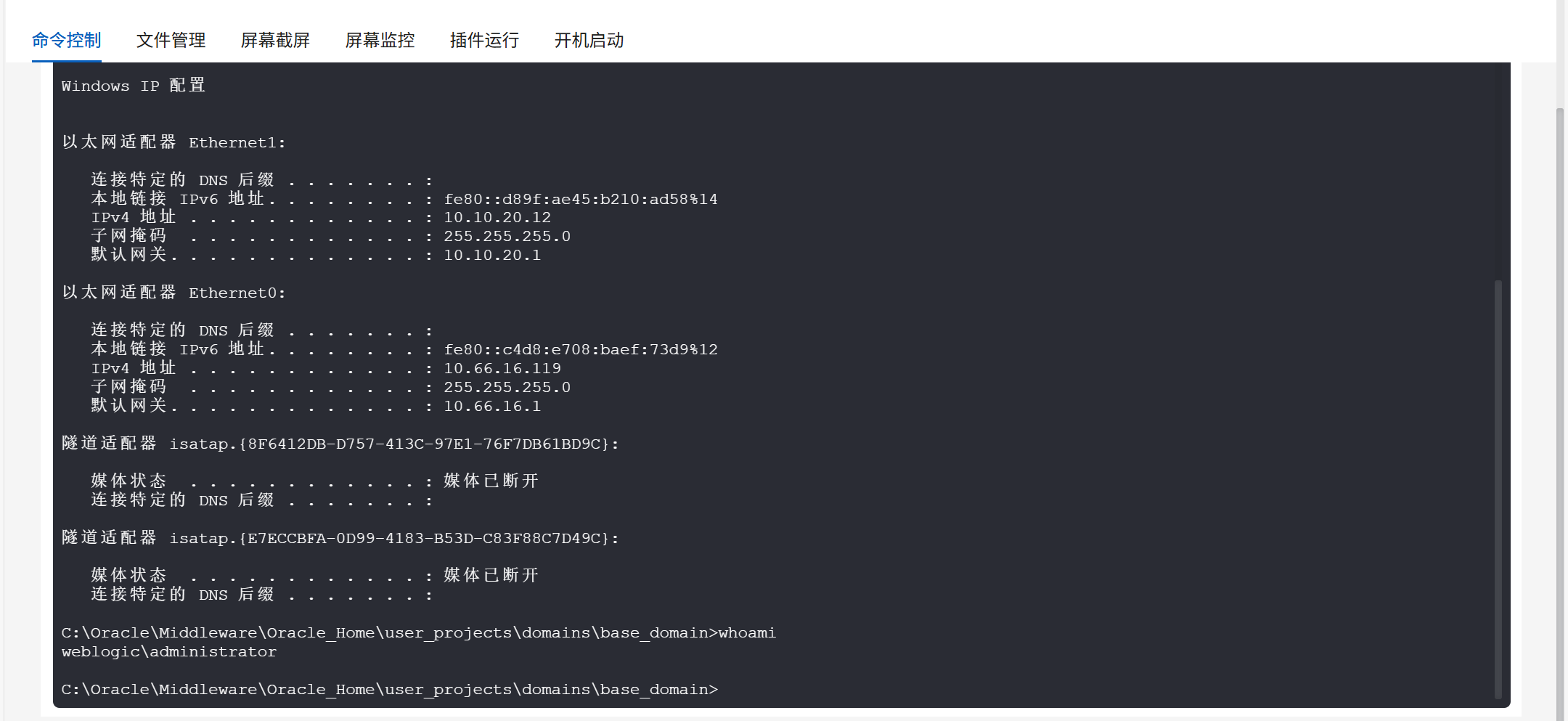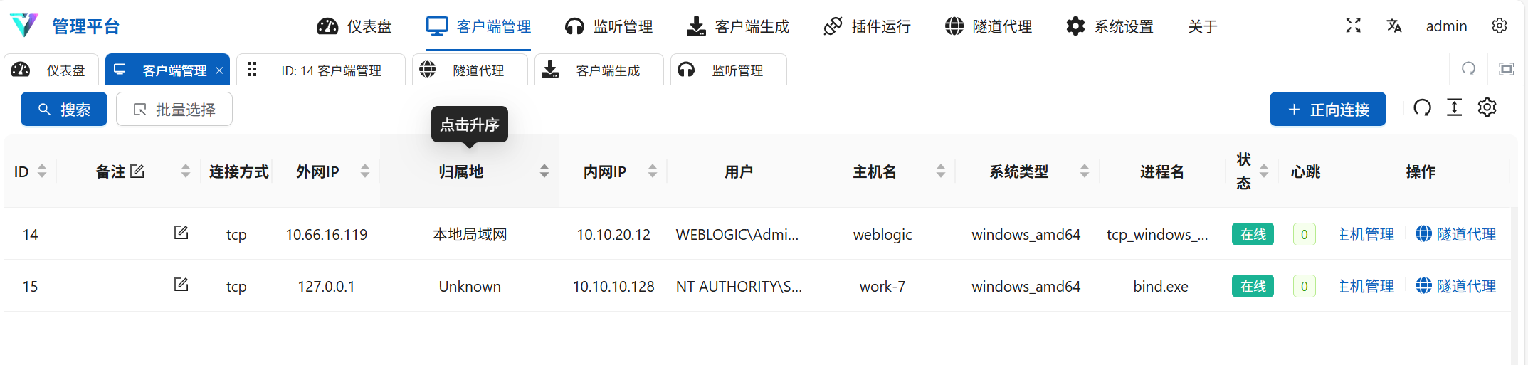查看网卡配置,看到了还有一个内网,网段是10.10.20.0/24,使用vshell搭建代理玩玩,这里的客户端我选择是ID:7也就是10.66.16.119这个主机的id