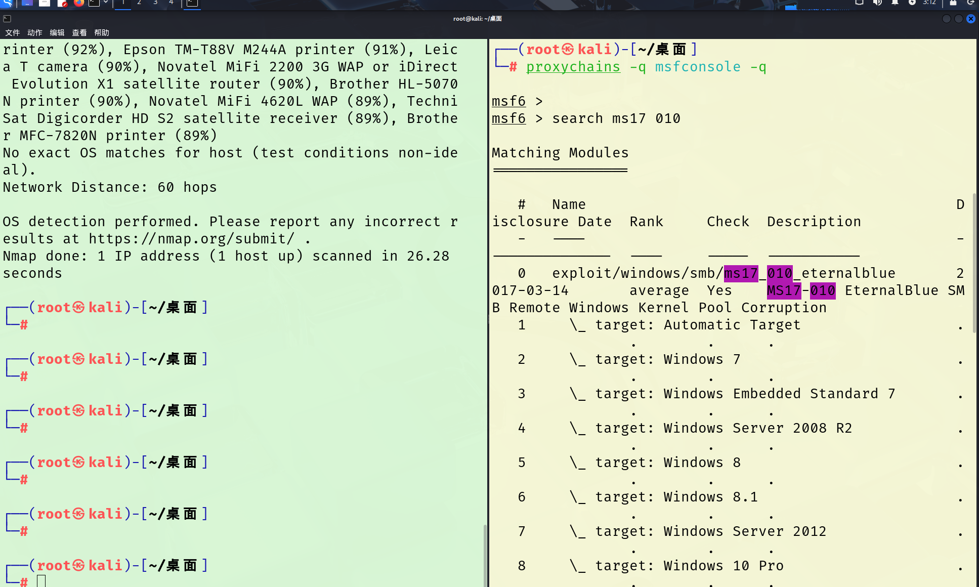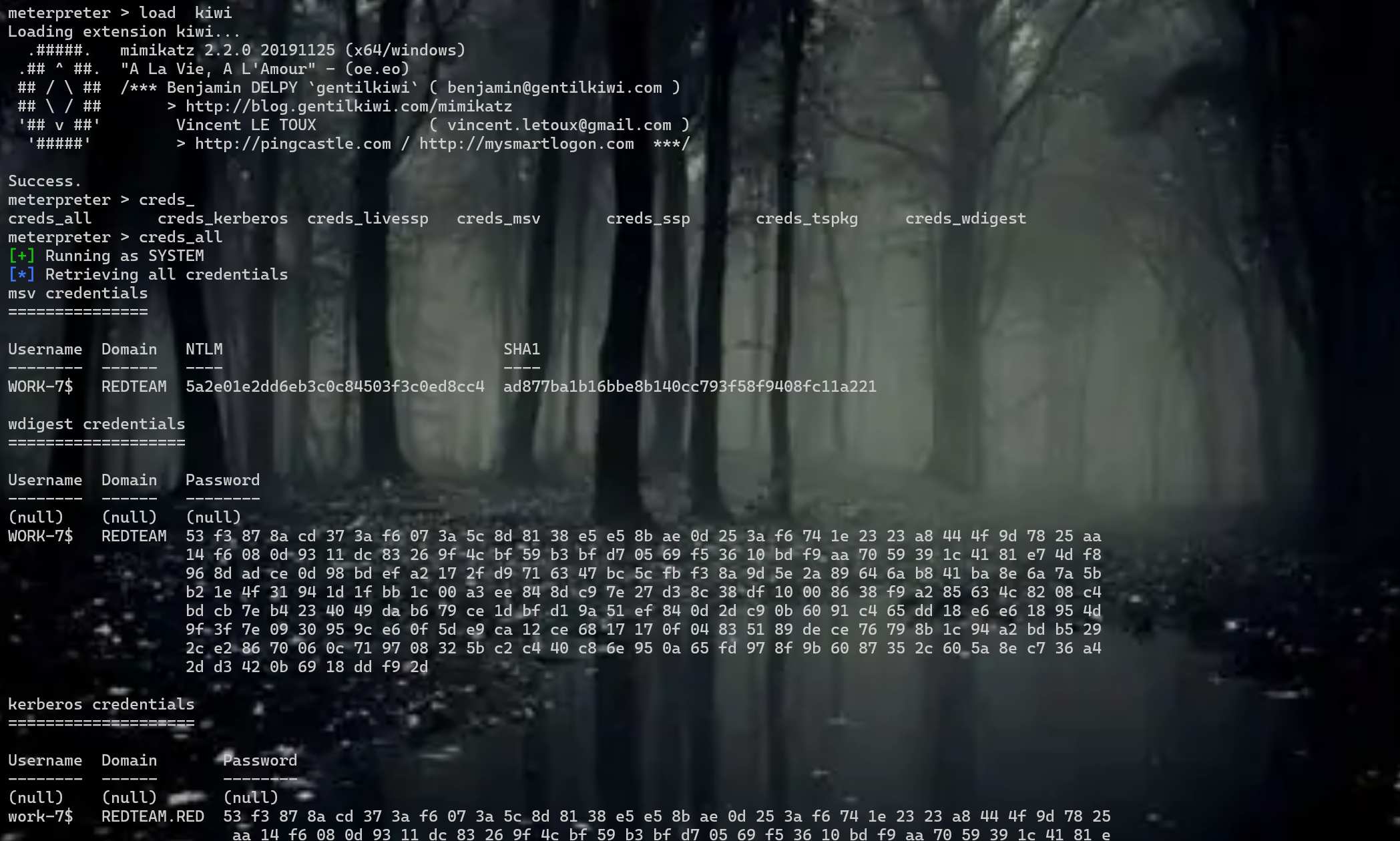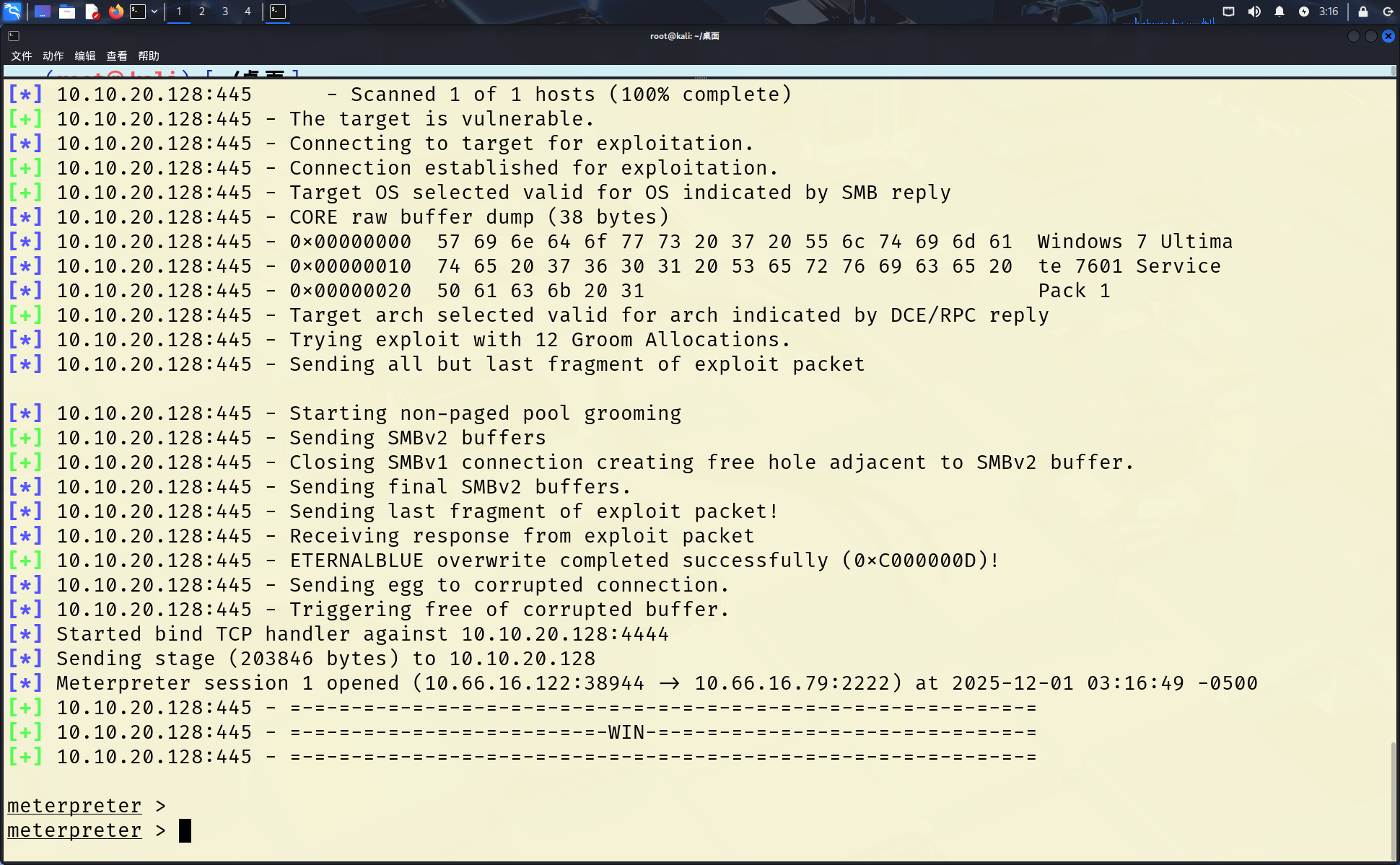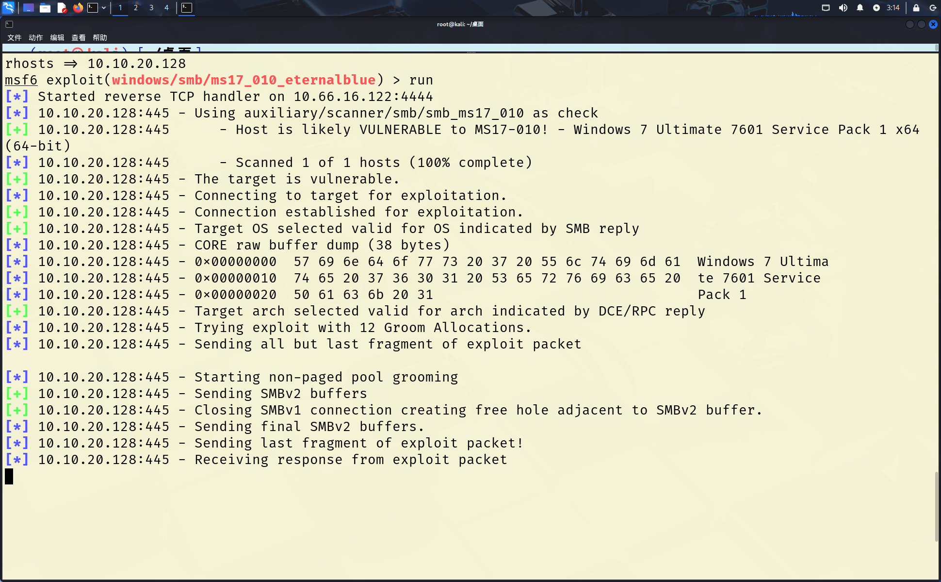 通过扫描我们得到了一个新的存活主机,10.10.20.128,是一个win7的系统,并且存在永恒之蓝,还是一个域内主机,主域名是redteam.red,我们先通过永恒之蓝对它来攻击一下