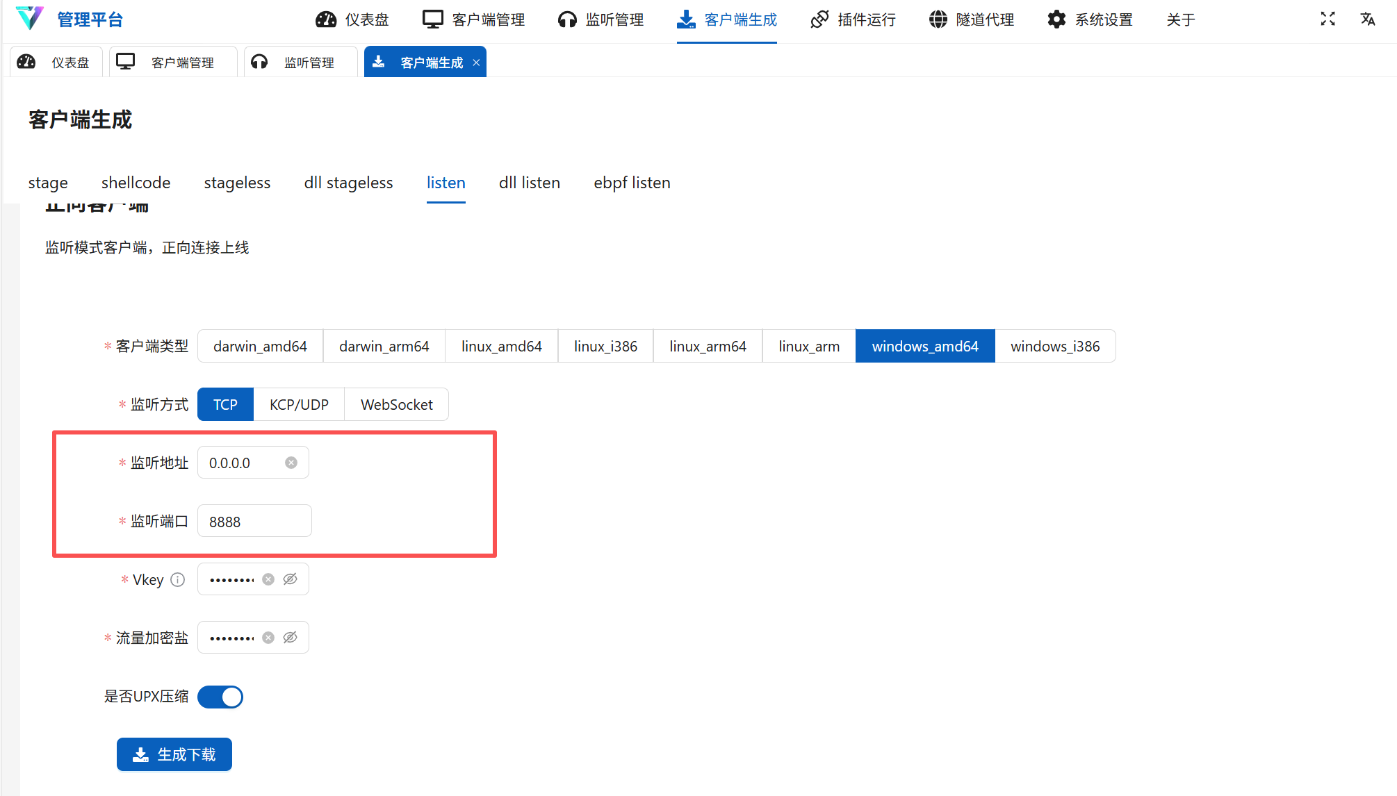 客户端运行木马之后会本地0.0.0.0开启8888端口来供vshell服务端连接,但是连接的时候要有vkey和加密盐值