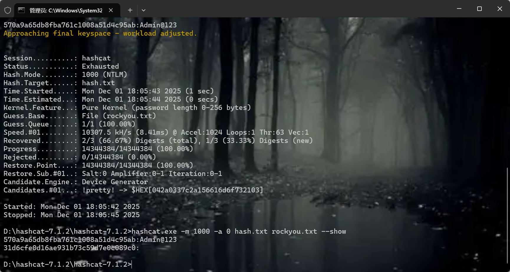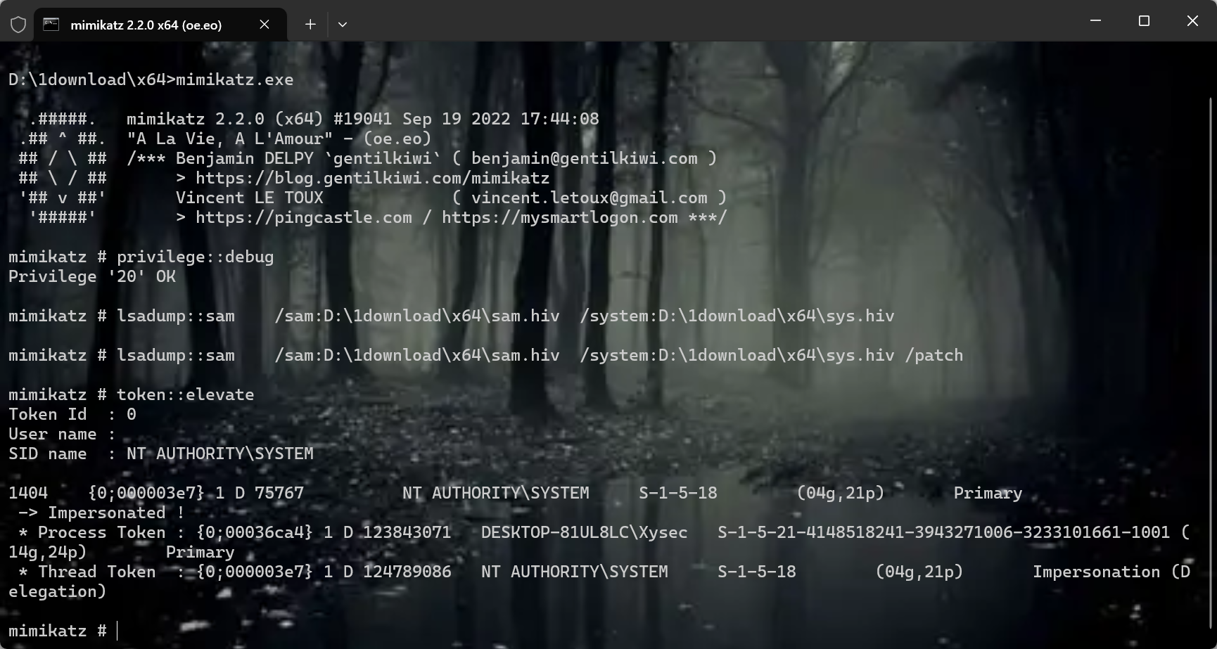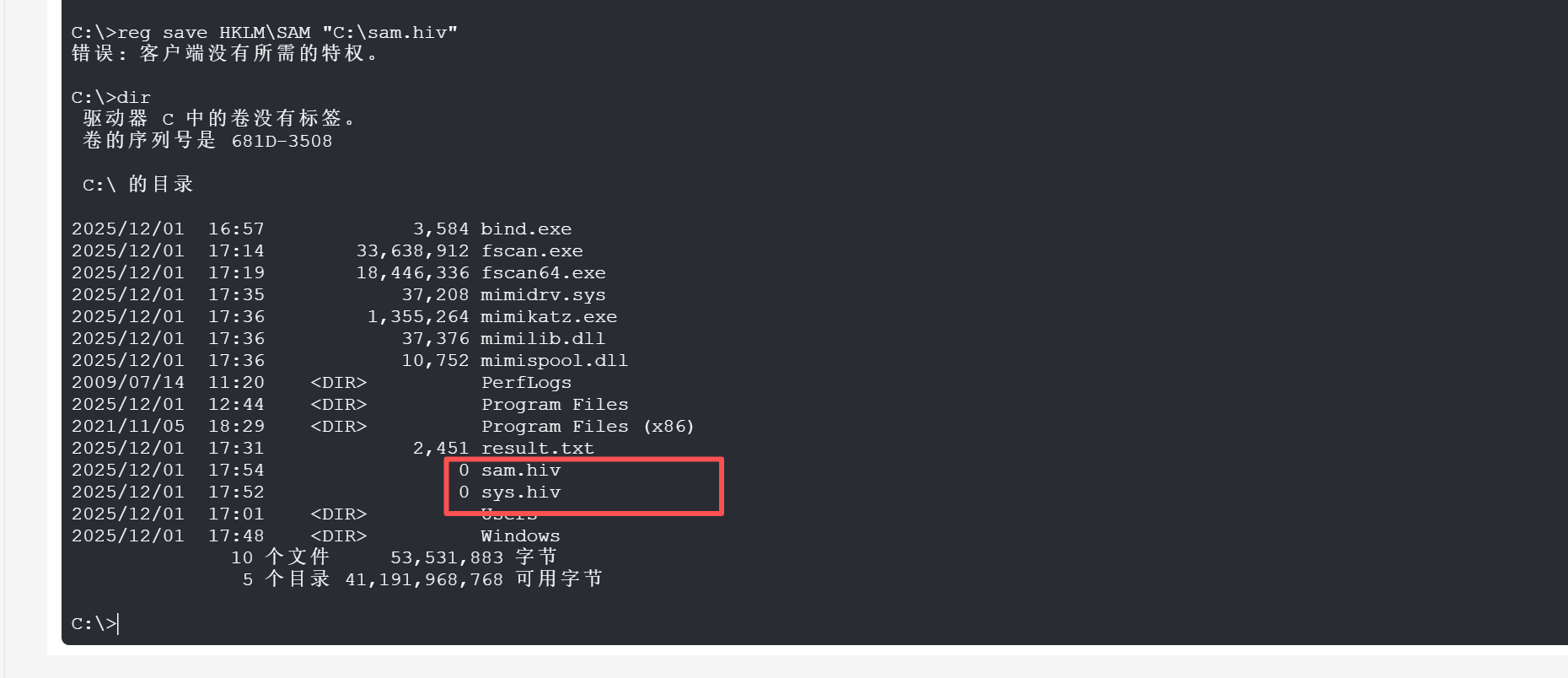 没有特权,但是也导出来了,下载,然后本地mimikatz试试,但是导出来的是假的,因为没有特权=-=