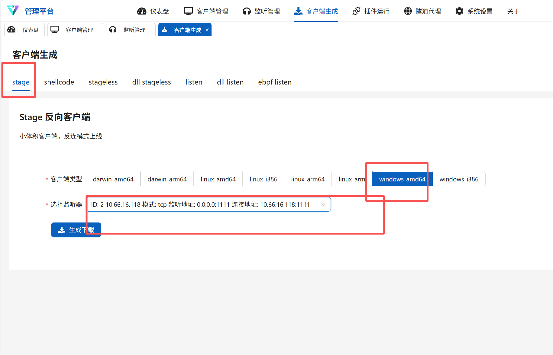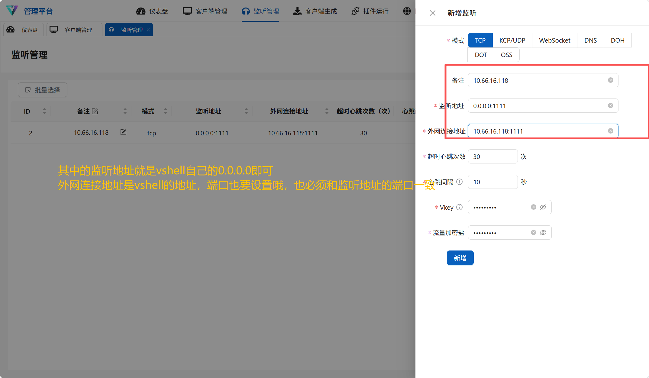 使用Vshell工具来让它上线一下吧,顺便我也熟悉一下这个工具,这里工具生成的反向连接木马不可以使用不知道为什么,然后我这里做的时候就使用了正向连接,步骤如下,先创建一个监听器,注意vkey和流量加密盐值