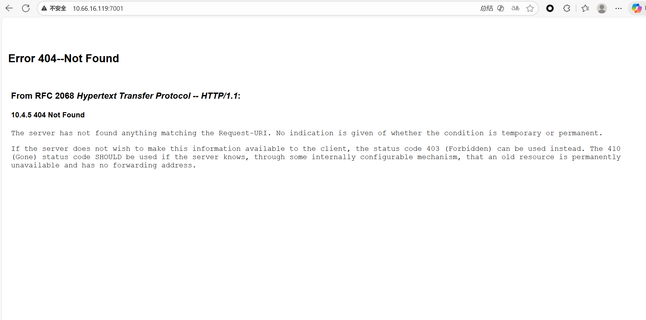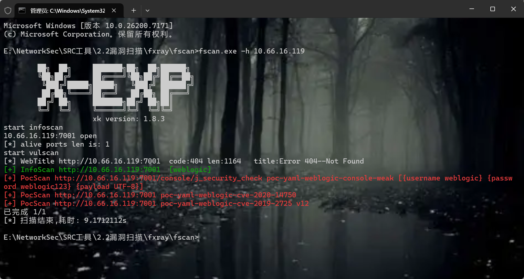 服务已经启动起来了,开始渗透测试,因为通过端口号和访问之后的404可以知道是一个weblogic的框架,所以直接使用weblogic工具、fscan、nuclei、xray等直接扫描漏洞利用即可