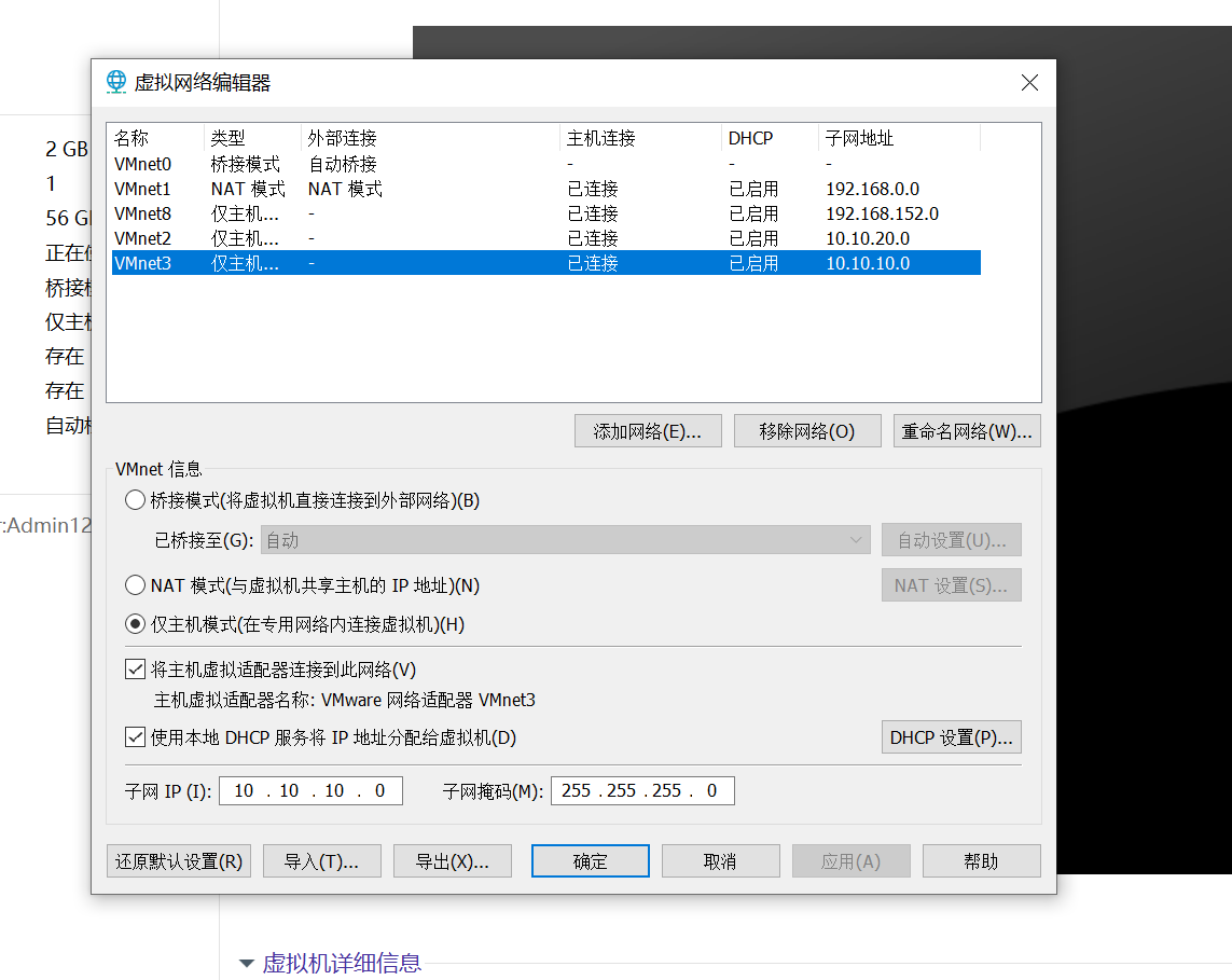 通过拓扑图,我们可以知道需要vmware需要三个网卡,其中weblogic为nat模式,其他的设置为仅主机模式,并且禁用网卡,vmnet1为192.168.0.0/24(nat)、vmnet2为10.10.20.0/24(仅主机)、vmnet3为10.10.10.0/24(仅主机)