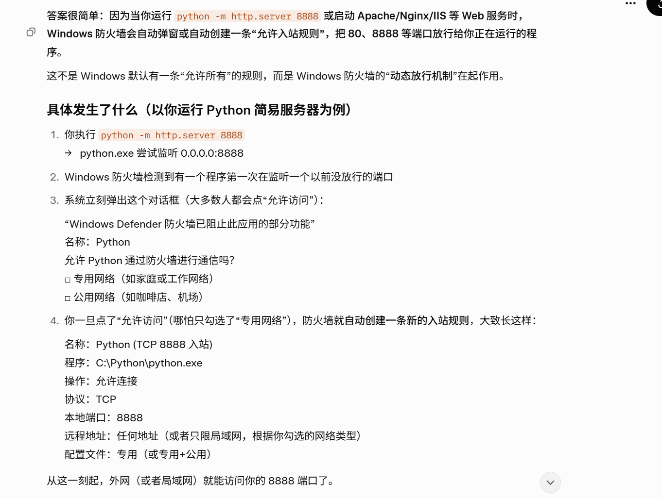 这里我不是很明白,为什么我们在搭建网站之后不需要放心某个端口,但是可以访问呢,所以问了一下AI