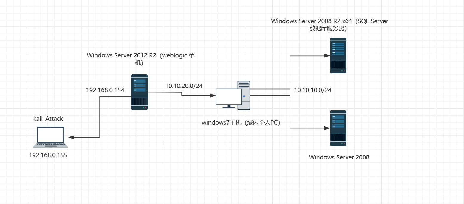 由收集到的信息,可以知道网路的出口是Windows Server 2012 R2,出口ip地址是192.168.0.154,之后是win7主机,之后就是对Windows Server 2008和Windows Server 2008 R2 x64(SQL Server 数据库服务器)进行渗透了,说的不太清楚, 请看如下拓扑