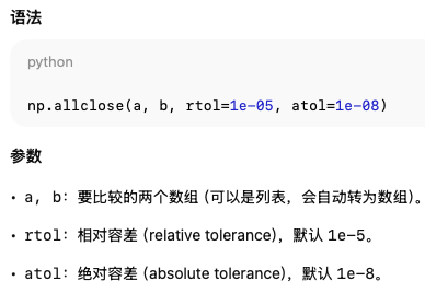 # np.allclose用来判断两个数组在元素级别上是否"足够接近",通常用于浮点数比较,避免直接用 == 导致精度问题。