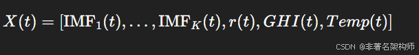 将所有 IMF 分量、剩余项,以及外部特征(如 GHI、T)拼成特征矩阵