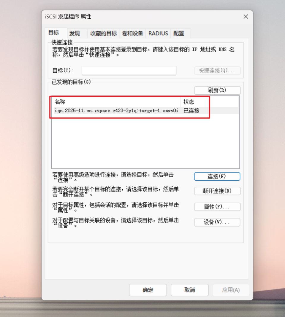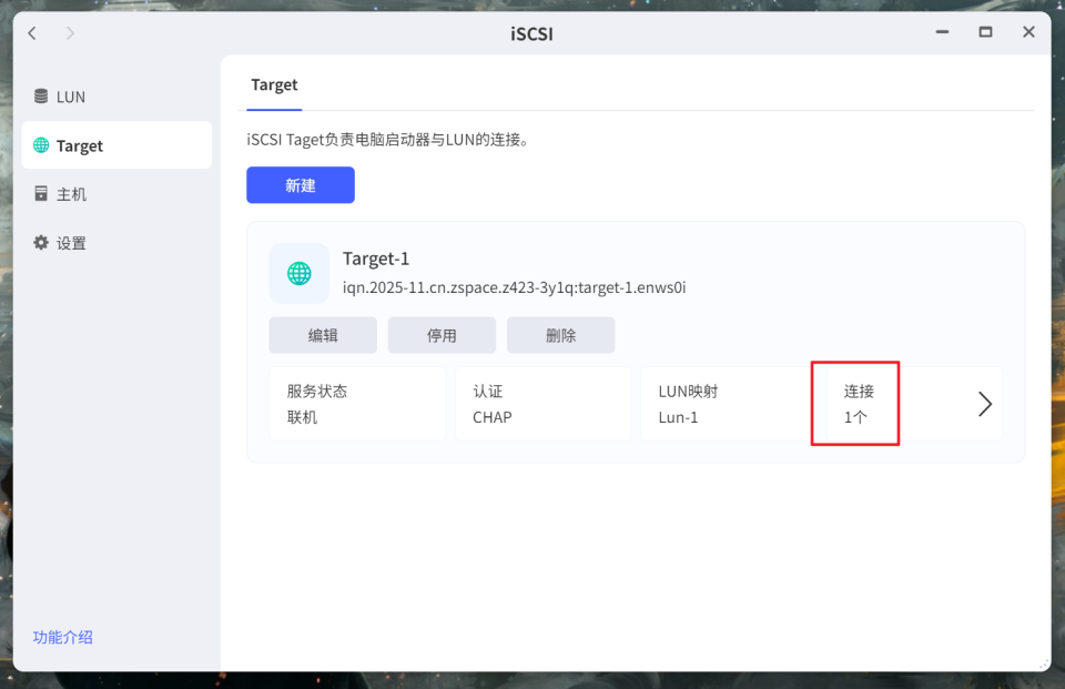 🔺我们这个时候回到极空间这边的iSCSI应用的Target选项已经可以看到有一个连接,通过IP地址可以得知,这个连接正是我们设置的这台电脑。