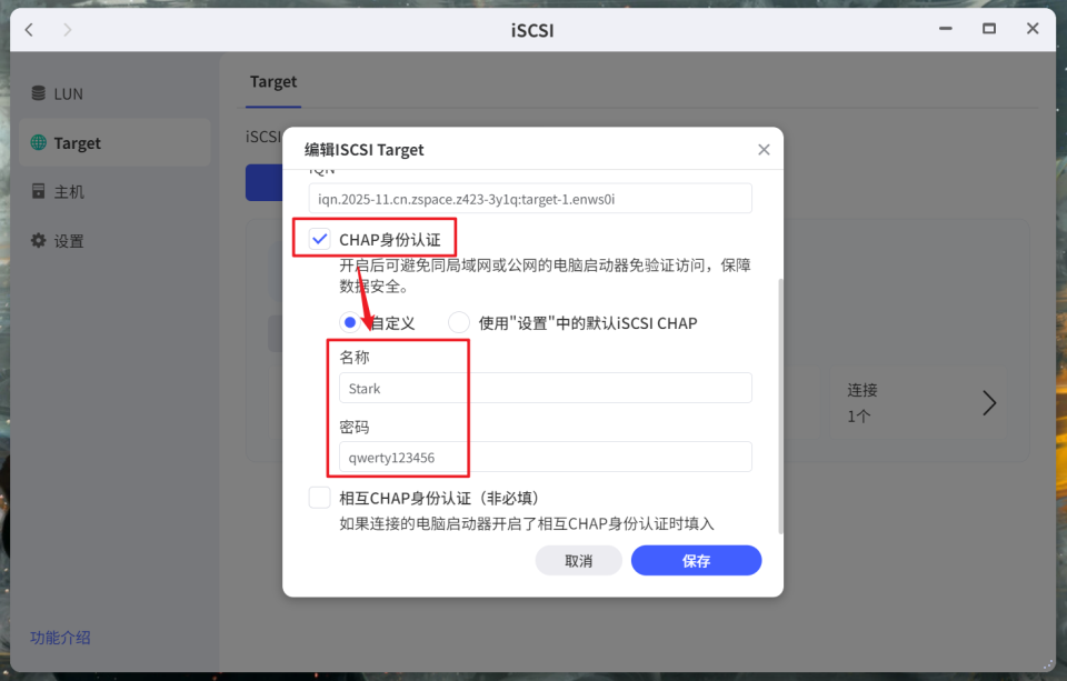 🔺这里勾选"CHAP身份认证",自己随意设置名称和密码。极空间这里的密码设置有点复杂,要求最低12个字符~