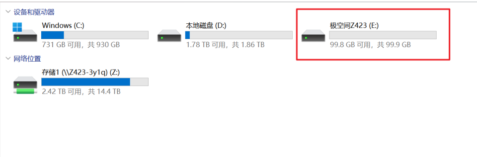 🔺并且在"此电脑"中,可以看到这个iSCSI LUN(硬盘空间)是和我们本地电脑磁盘在一起的,而不是和SMB挂载一样,显示在"网络位置"中。