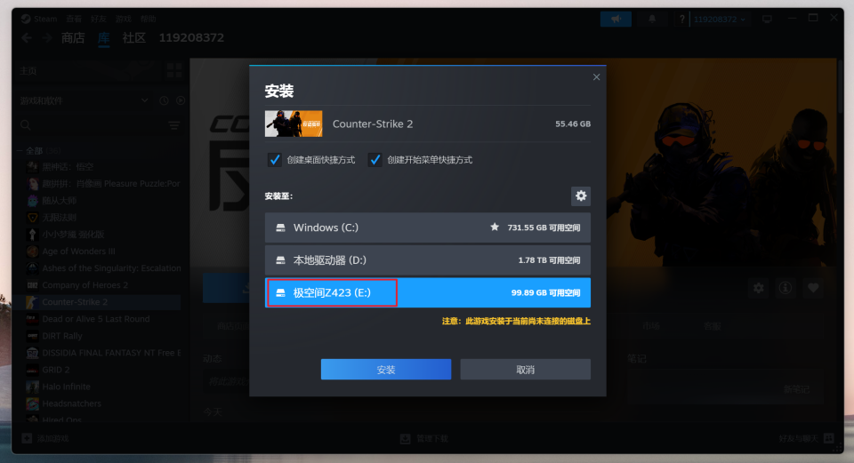 🔺同样,我们现在打开Steam安装游戏的时候,安装位置同样可以选择iSCSI LUN,直接可以不使用电脑自己的硬盘了,而这,也正是iSCSI功能"真·扩容"的实力所在。