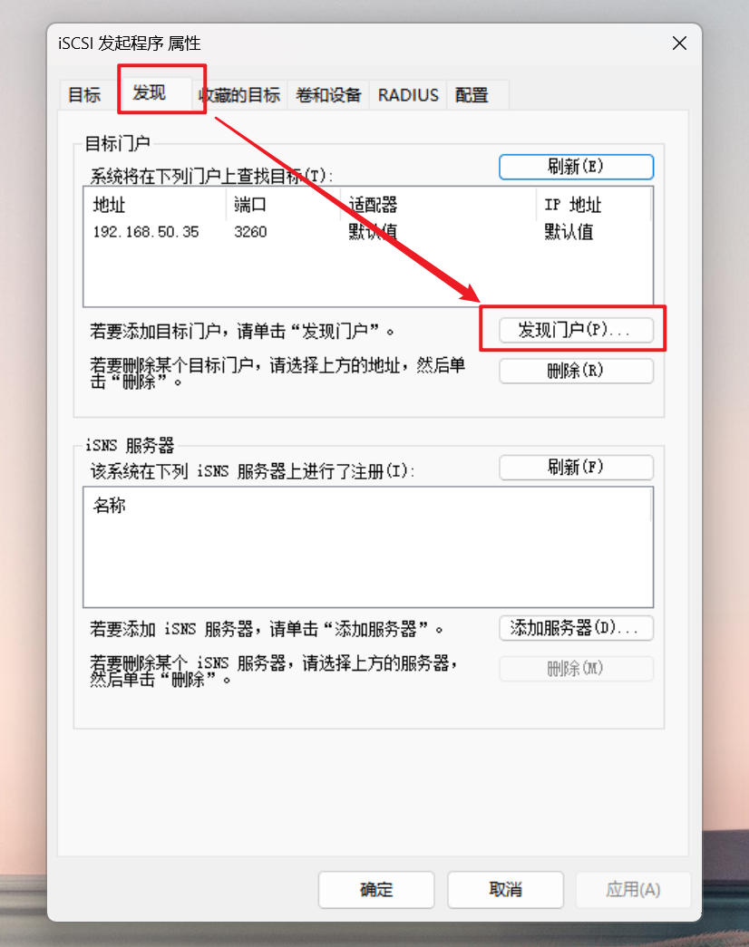 🔺然后在"已发现的目标"下面就会有一个"不活动"的目标,它其实就是我们在极空间NAS上建立的iSCSI服务,我们需要选中这个目标并点击"连接"。