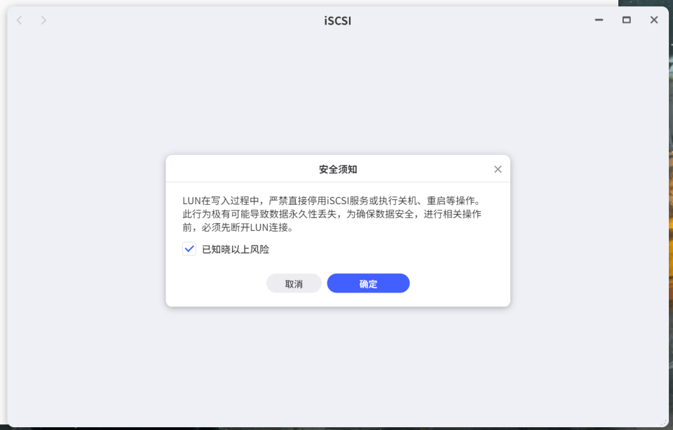 🔺安装都是自动的,安装好iSCSI之后直接打开,会有一个"安全须知",勾选之后点"确定"。