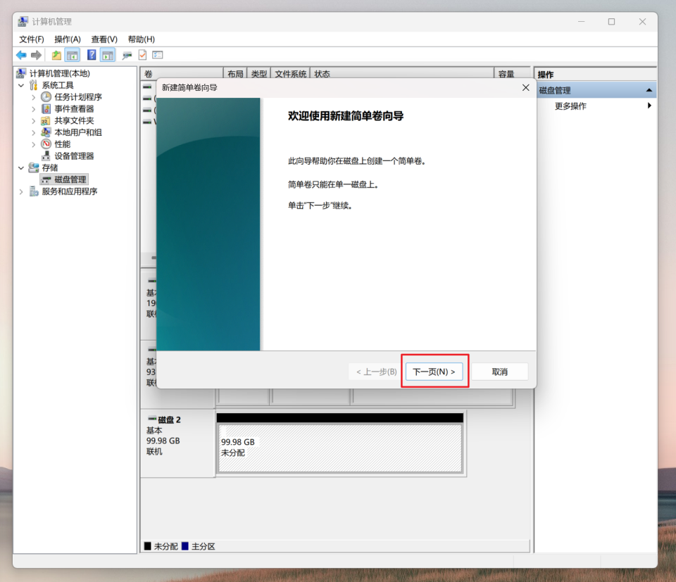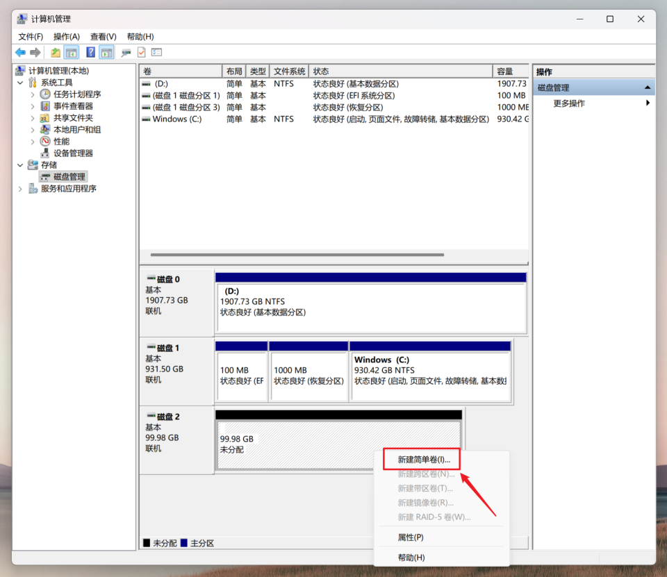 🔺接着在这个未分配的磁盘右击选择"新建简单卷",进行初始化操作。