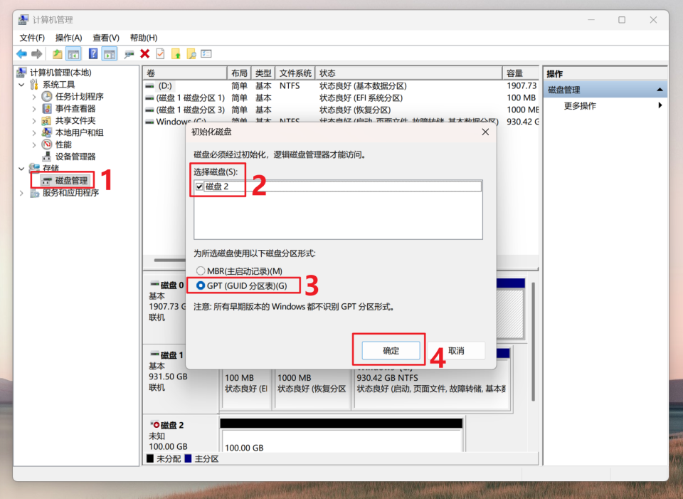🔺然后选择"磁盘管理",页面会自动弹出一个没有被初始化的新"磁盘"(我这里显示的为"磁盘2"),选择GPT分区,点"确定"。