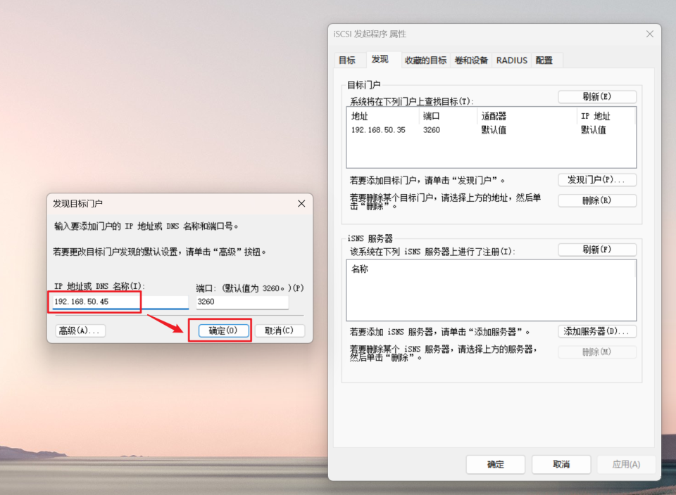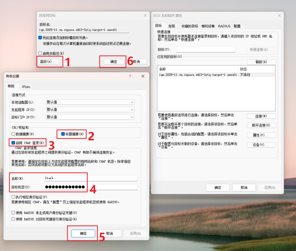 🔺打开的页面点击"高级",勾选"标题摘要"和"启用CHAP",然后在下面的"名称"和"目标机密"中输入我们在Target中设置的CHAP用户名和密码,完成之后点两个"确定"。
