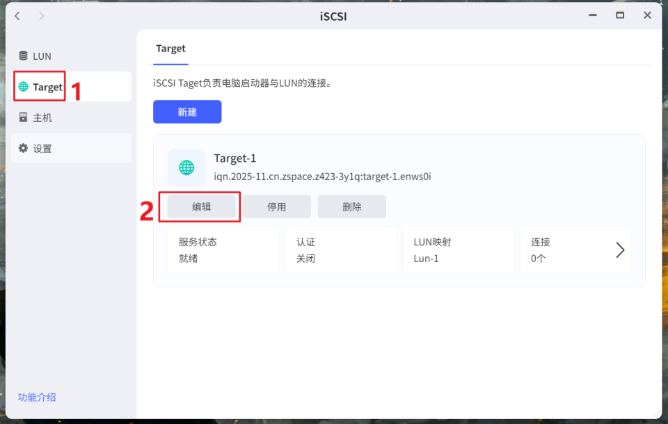 🔺LUN创建好之后,点击"Target"选项,开始"编辑"我们刚选择的Target。