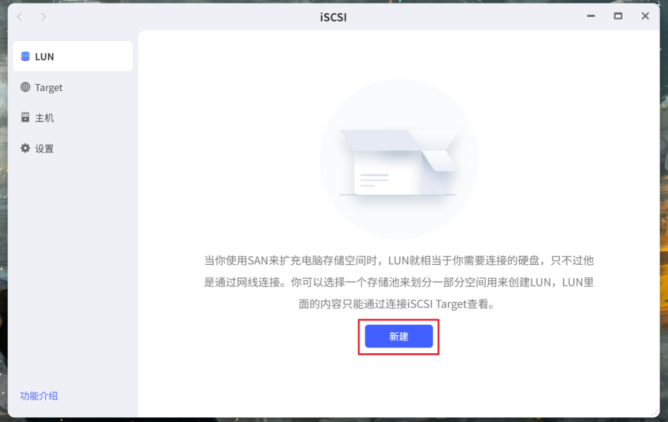 🔺在iSCSI功能页面也会有一些专业性的介绍,好学的小伙伴可以了解下,和我一样的学渣直接点"新建"。