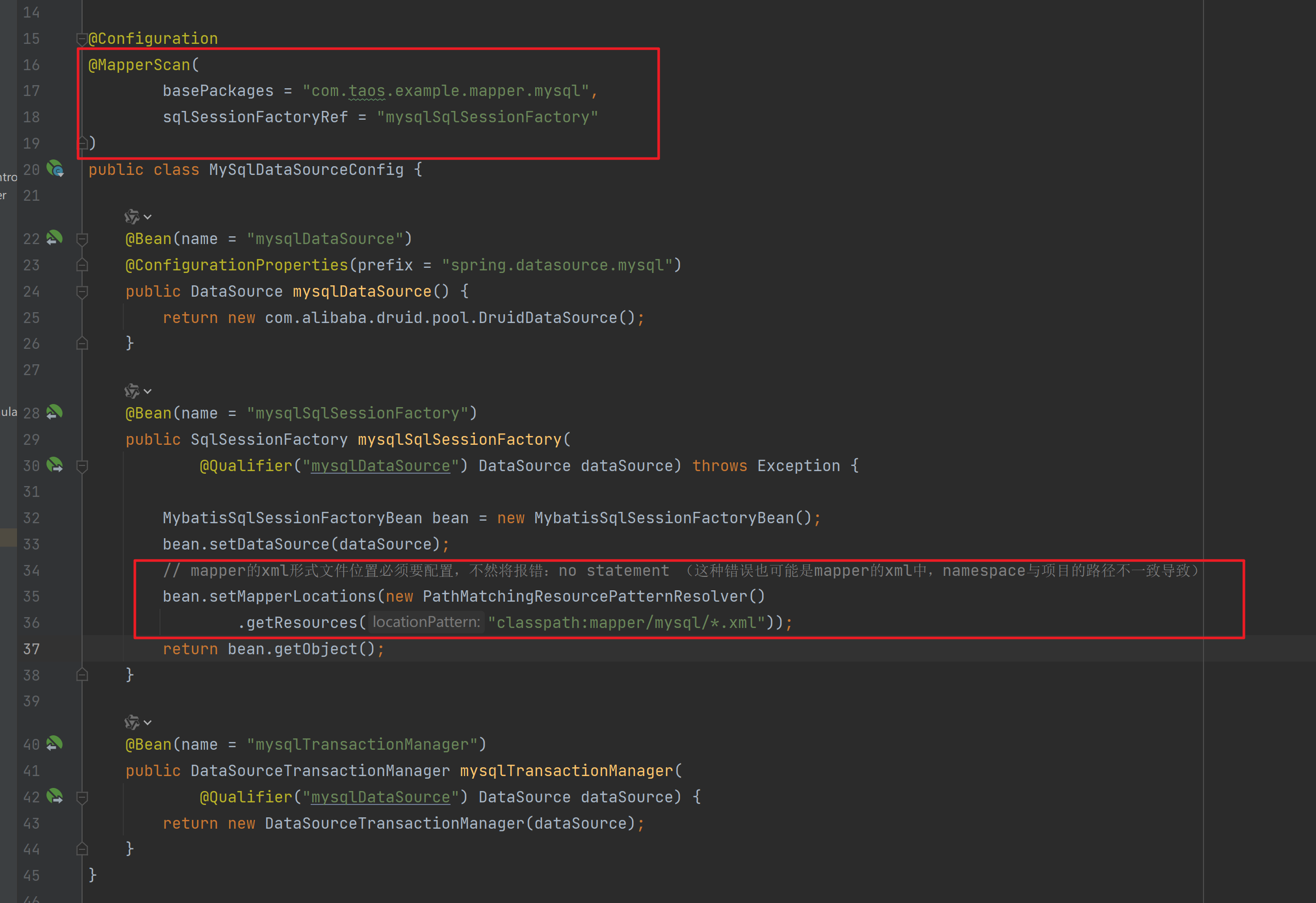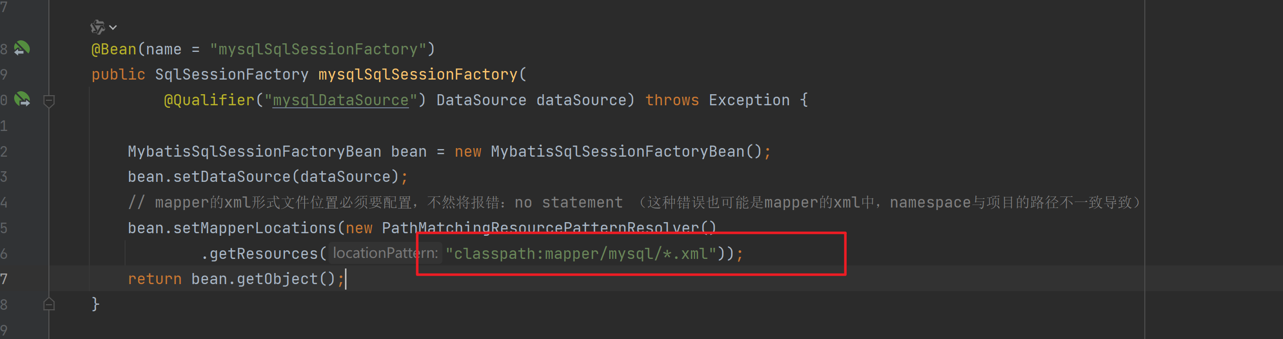 public SqlSessionFactory mysqlSqlSessionFactory(@Qualifier("mysqlDataSource") DataSource dataSource) throws Exception {