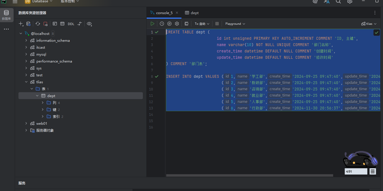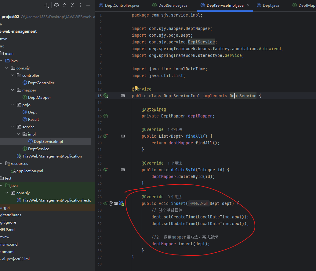 在逻辑处理层,由于我们传来的json数据只有name属性,id是自增的,所以我们需要手动去给这个数据封装对象设置更新和创建时间,然后我们调用deptMapper将dept对象传输给mapper,让他进行数据库操作