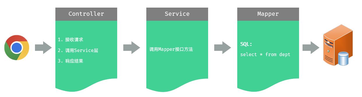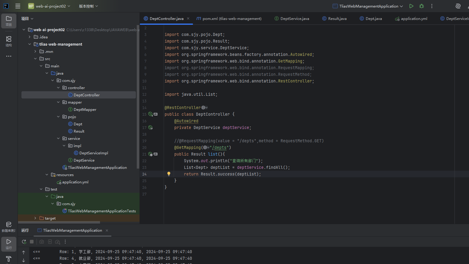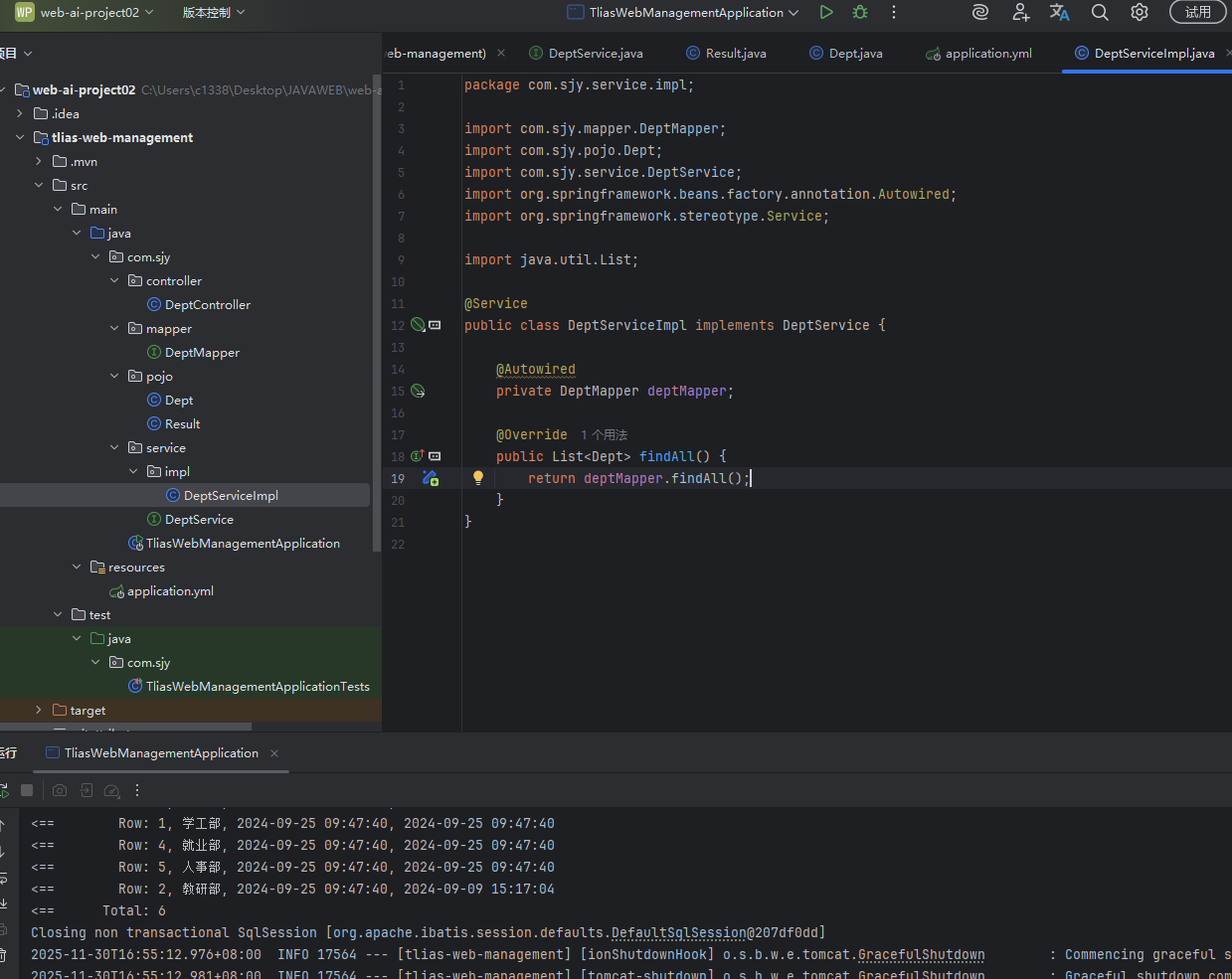 首先先实现Controller层,我们首先一个方法list需要接受到查询部门 /depts 的get请求,这个方法需要从数据库查询对应内容,然后返回响应结果Result。因此我们需要一个在类中定义一个DeptService对象,标注注入标签,负责从IOC容器中,接受到对应的逻辑处理对象,接受到后调用DeptService的findAll()方法,去数据库中查找对应数据。