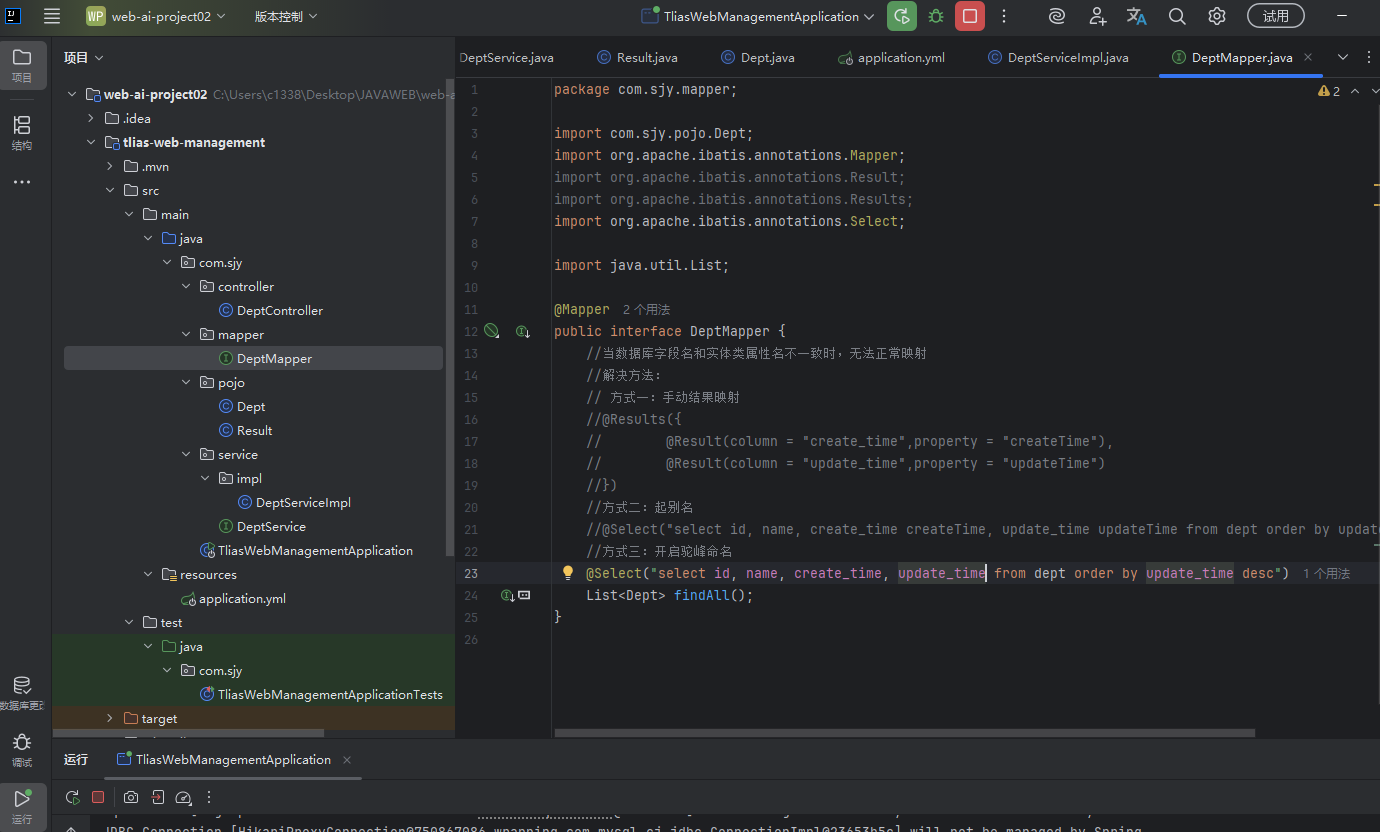 @Select("select id, name, create_time createTime, update_time updateTime from dept order by update_time desc")