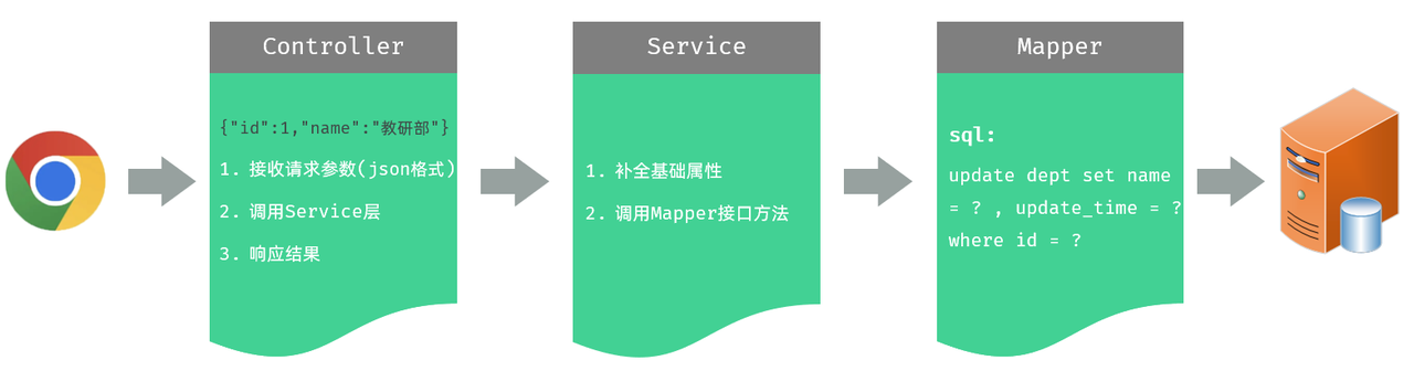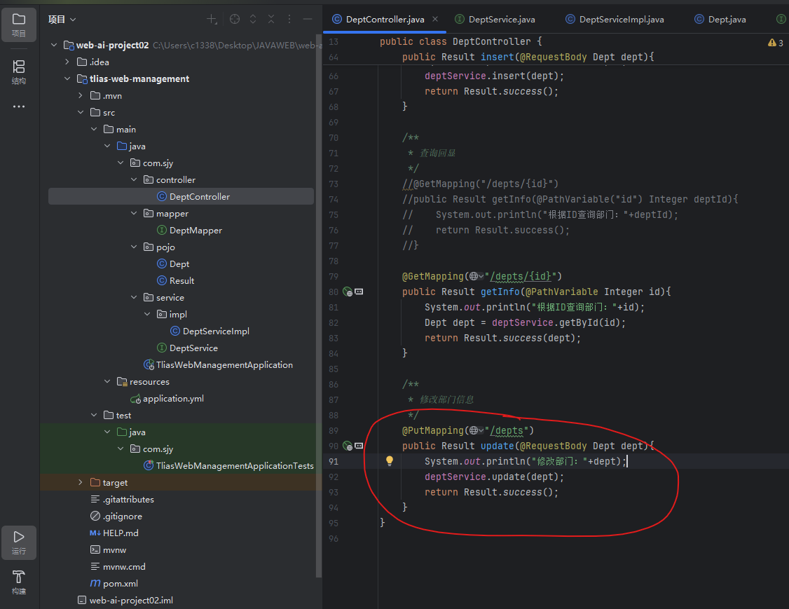 Controller层接收到put请求的时候,通过@RequestBody接受put请求的json对象,调用deptSevice对象的update方法
