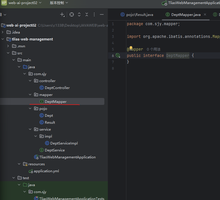 在mapper软件包里创建一个DeptMapper接口,并标记为@Mapper持久层即MyBatis的映射器接口,告诉Mybatisi框架这个接口需要被扫描并生成代理实现类(用于简化JDBC的流程)