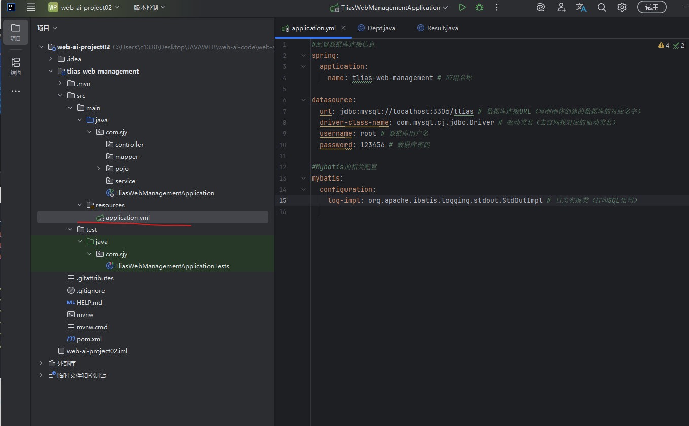 url: jdbc:mysql://localhost:3306/tlias # 数据库连接URL(写刚刚你创建的数据库的对应名字)