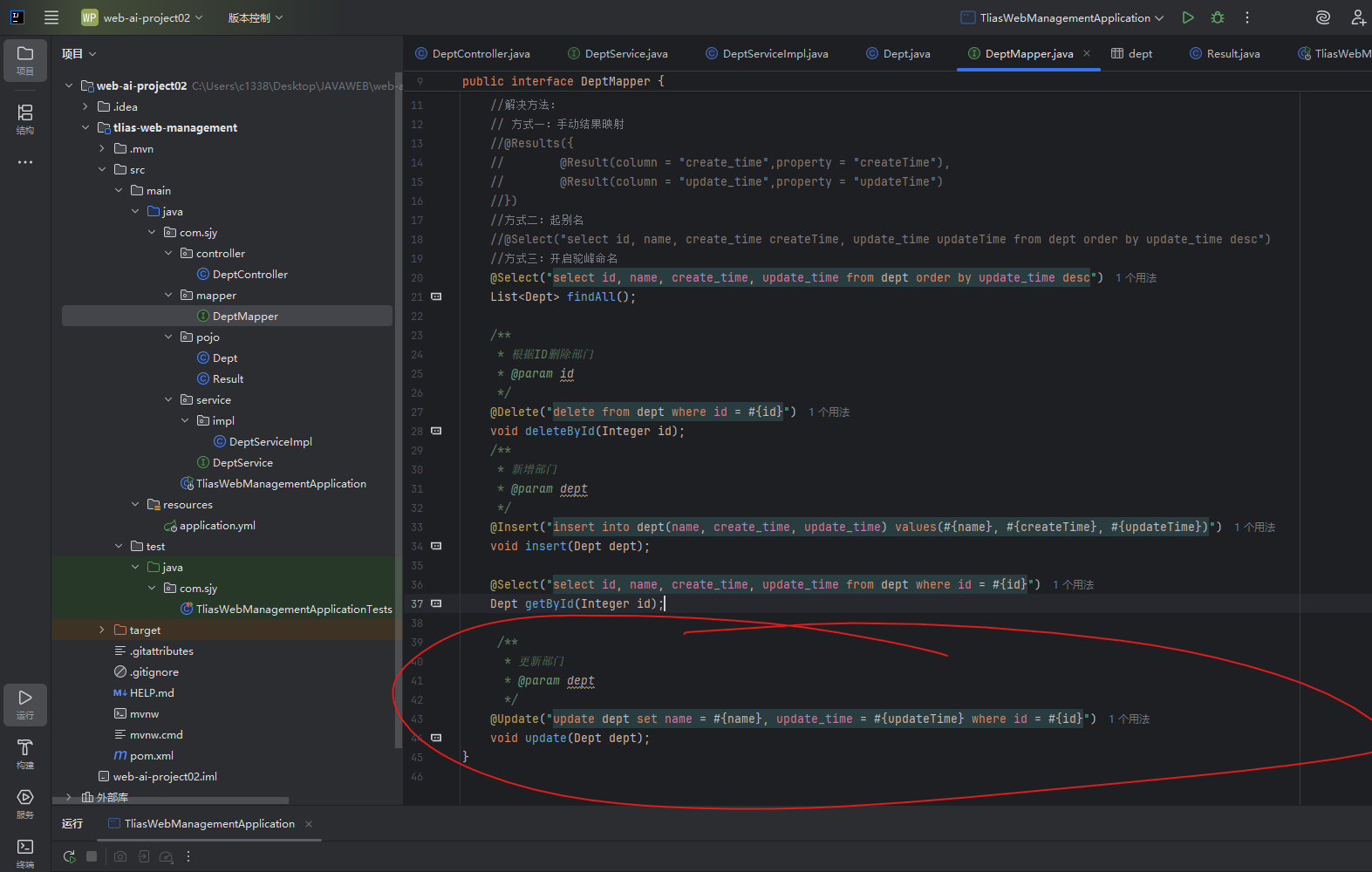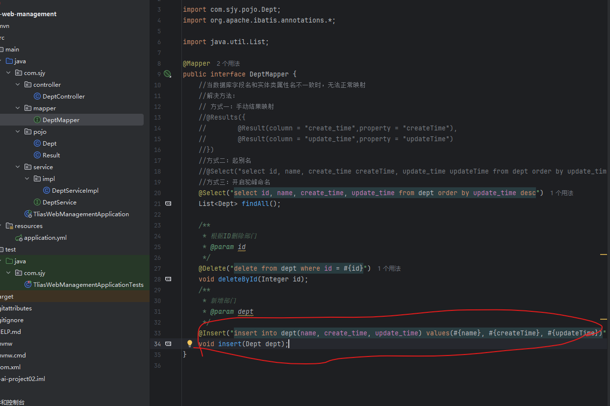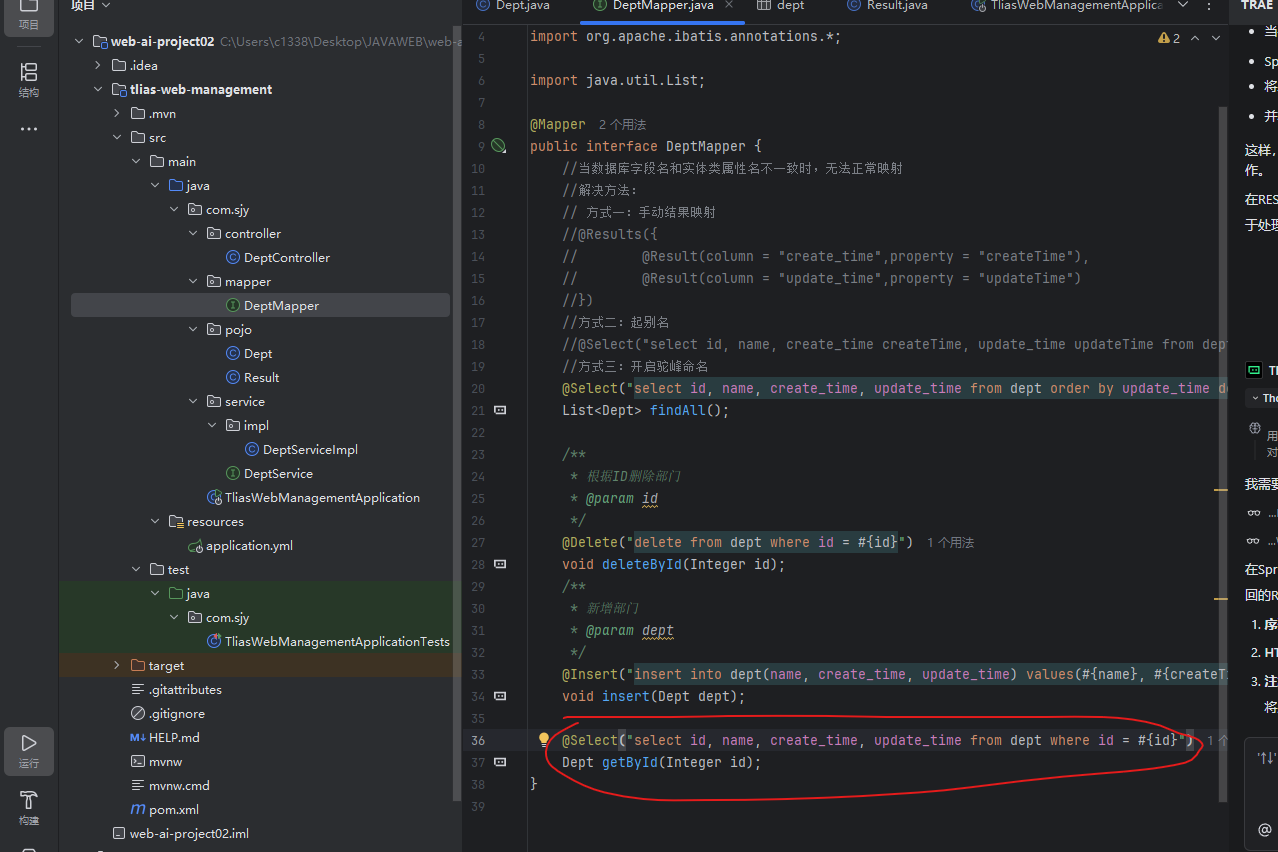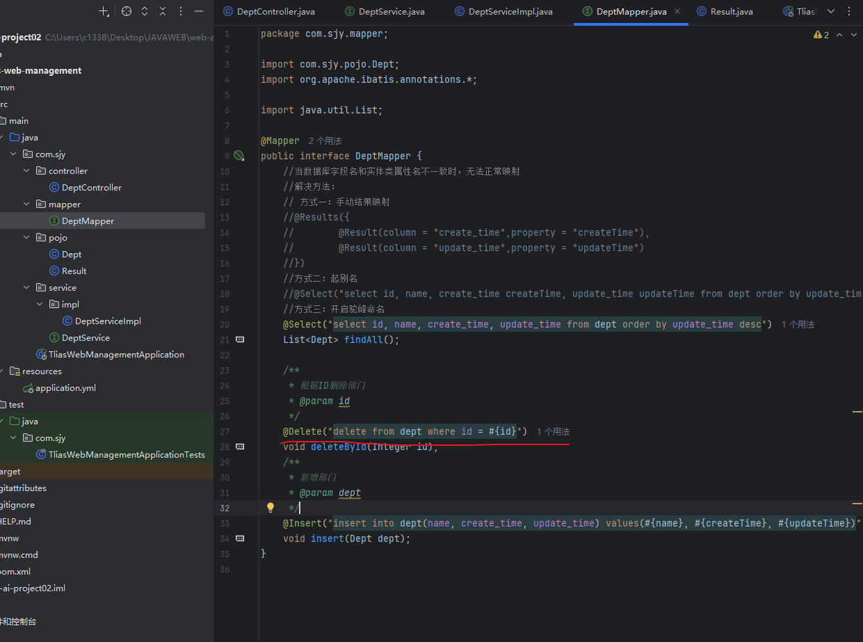 最后在DeptMapper接口,通过@Delete注解就可以执行删除语句 "delete from dept where id = #{id}" 其中#{id}是占位符**(在MyBatis中,#{id}表达式会根据参数名进行绑定。在当前的代码中,deleteById方法的参数名是id(Integer id),所以#{id}会精确地绑定到这个名为id的参数上。如果希望使用不同名称可以在参数前加@Param("与占位符的绑定名称"))**