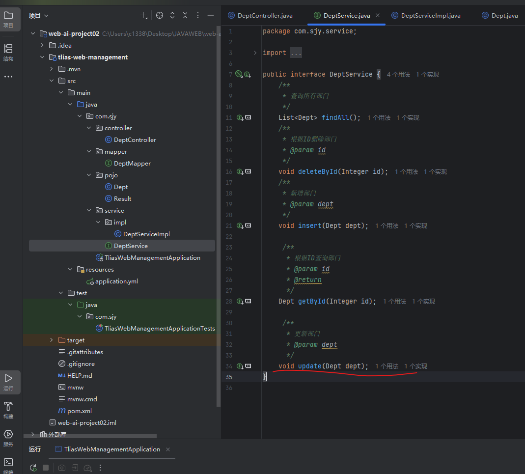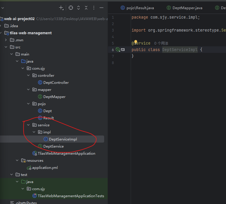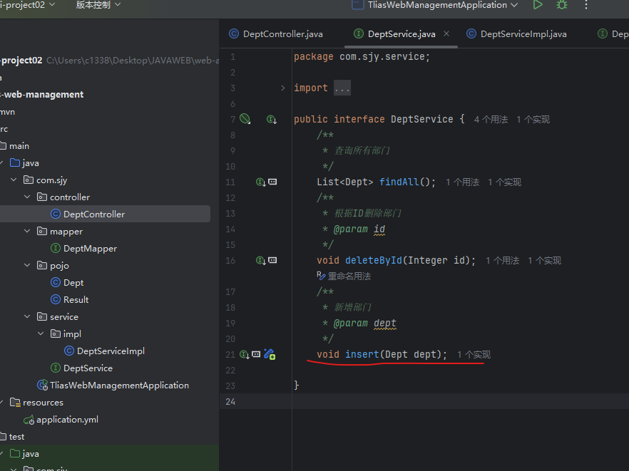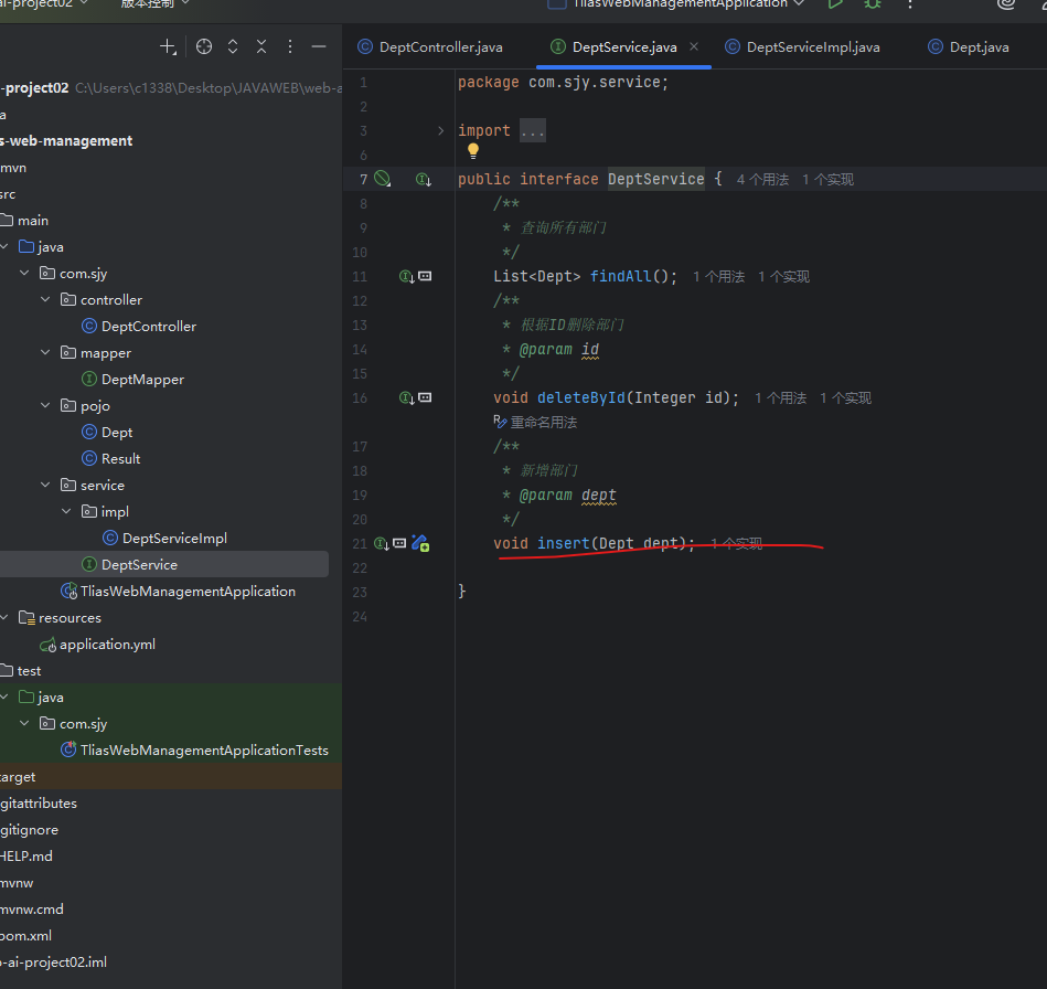创建一个DeptService接口和一个DeptServiceImpl实现类
