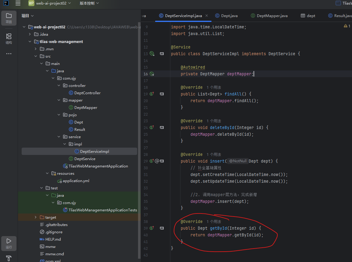 逻辑处理层,只需要去调用mapper即可,并传输指定id即可