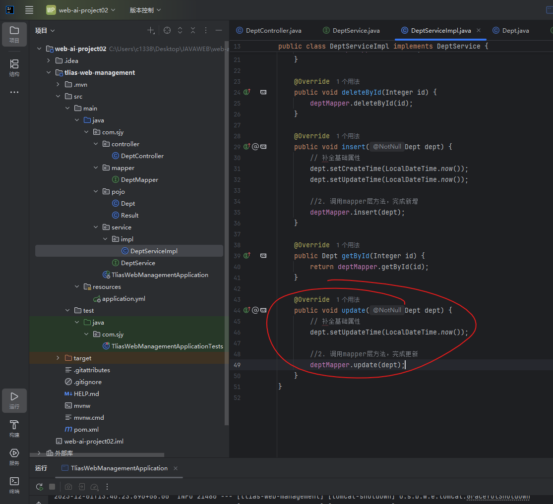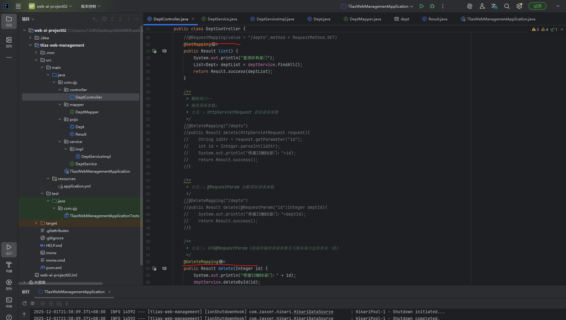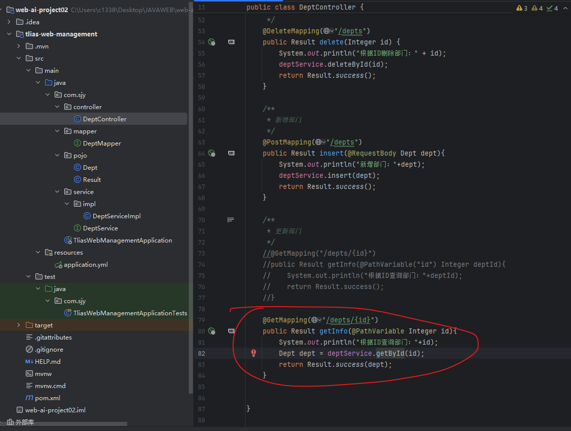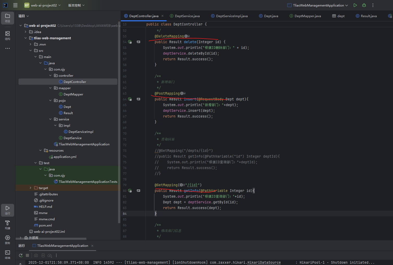 接收到要删除的id后,我们需要deptService对象去处理逻辑,传输id请求对应的mapper进行删除操作