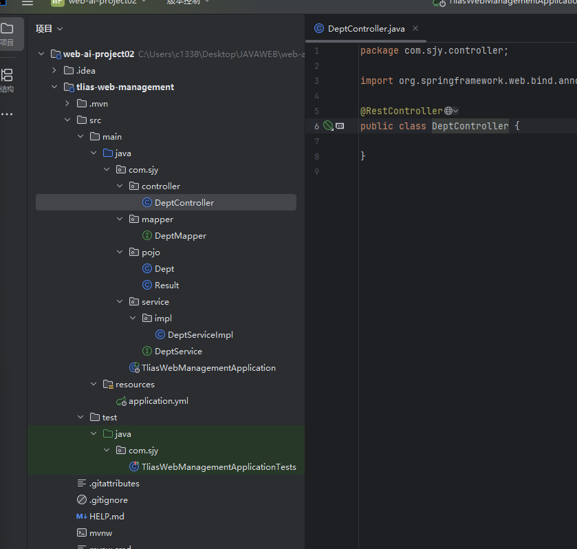 创建DeptController并标记为@RestController请求处理类(是@Contoller和@ResponseBody(将方法的返回值转json后返回给前端)的结合)