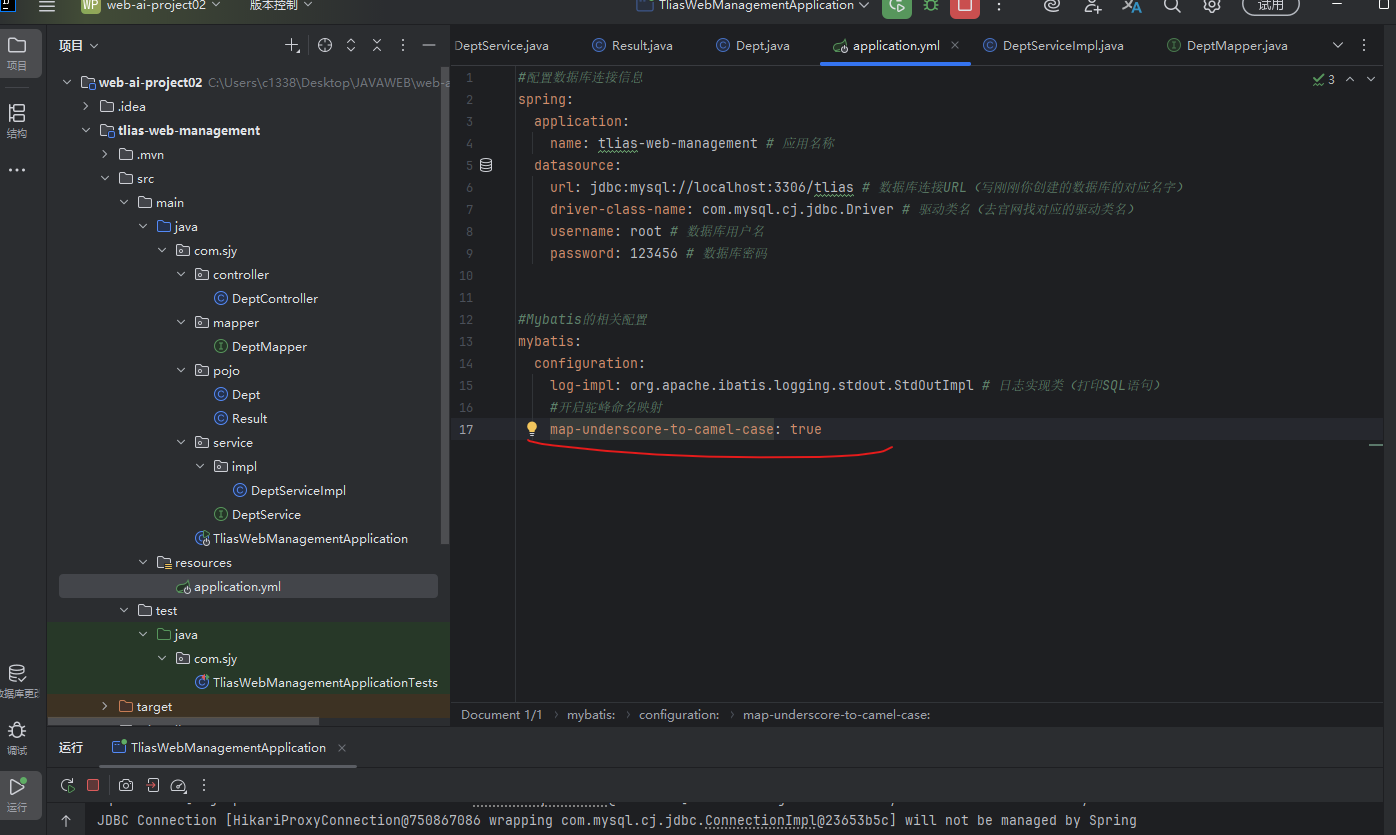 在将数据库数据封装到实体类Dept里时,会因为字段名与属性名不同而无法映射,这个时候我们可以到配置文件中开启驼峰命名(会自动将xxx_abc转换为xxxAbc驼峰命名属性,从而与你定义的类的属性对应)。
