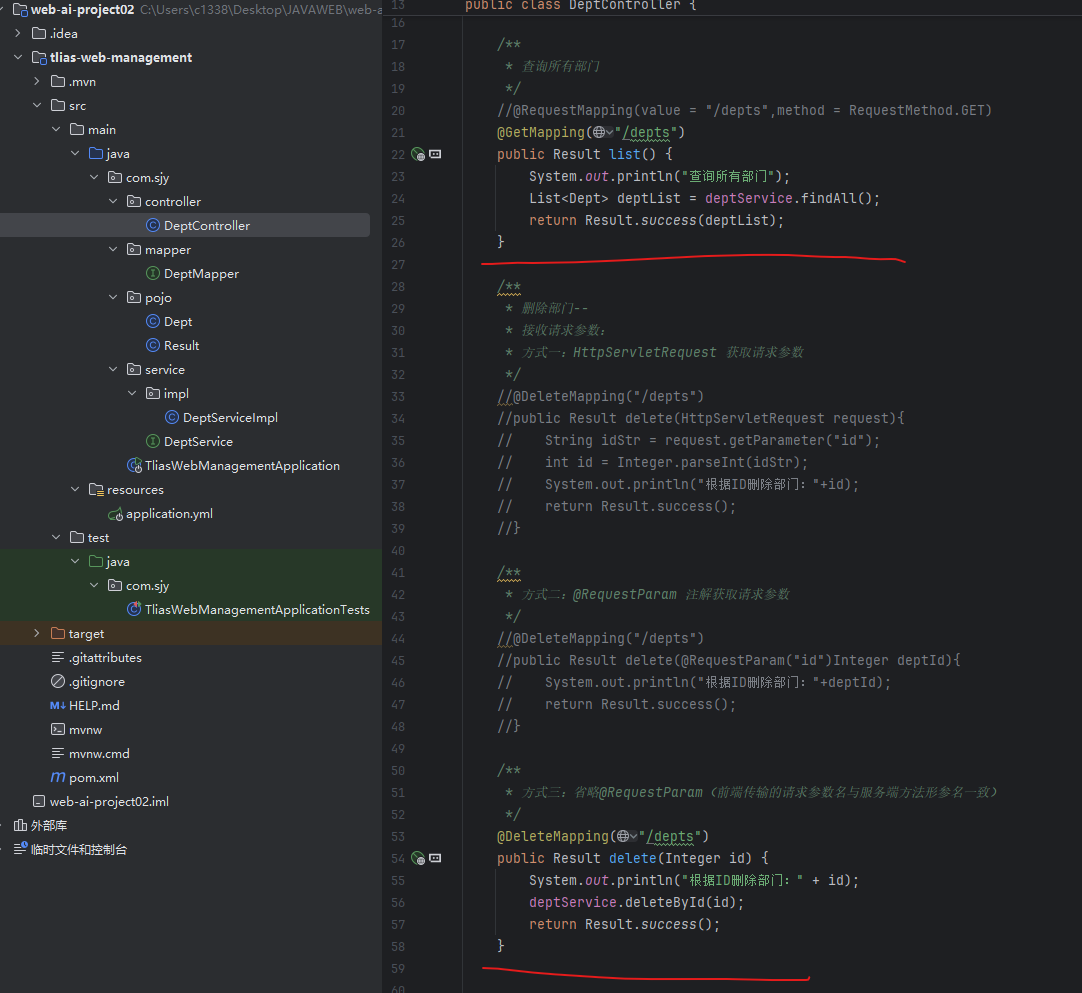 我们这时候回到Controller曾我们发现请求路径重复度很高,都有一个/depts,于是我们可以在请求处理类加上一个@RequetMapping("/depts")用于声明公共的请求路径,随后把所有请求处理方法删除公共部分。