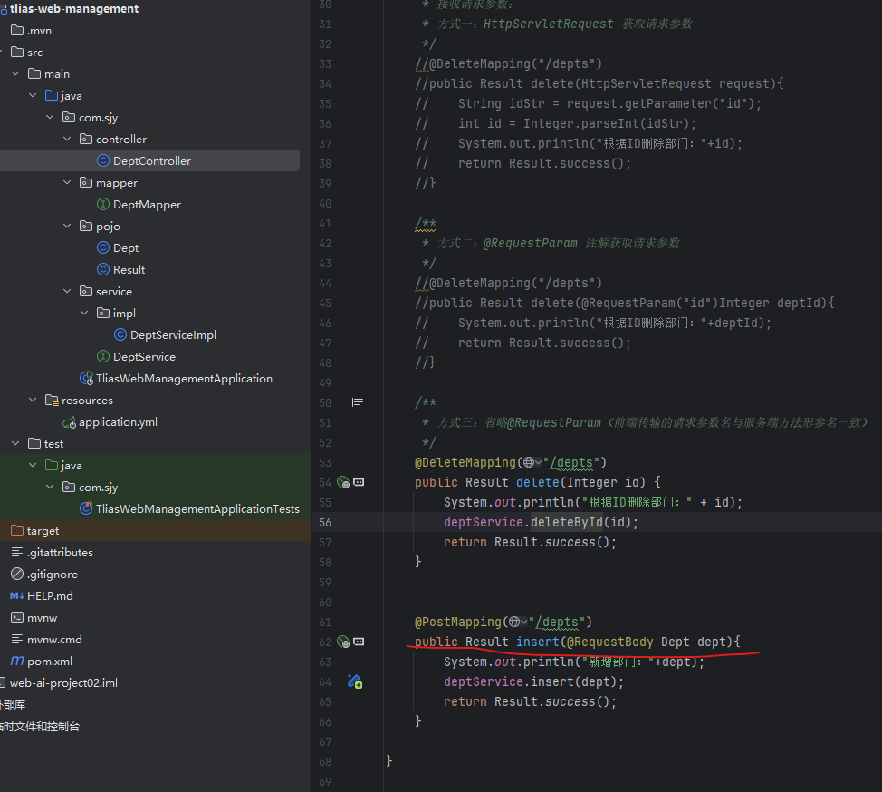 在Controller层通过给一个Dept参数一个@RequestBody注解(将HTTP请求体中的JSON或XML数据自动解析并绑定到Java对象上) 将json数据v转换为Dept类型的java对象并赋值给dept参数。
