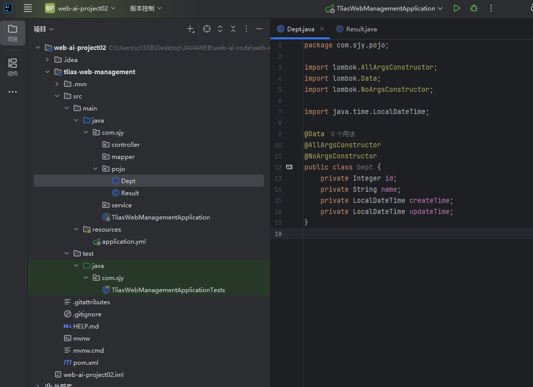我们在pojo包中创建一个 部门类Dept 和一个 统一响应结果类Result