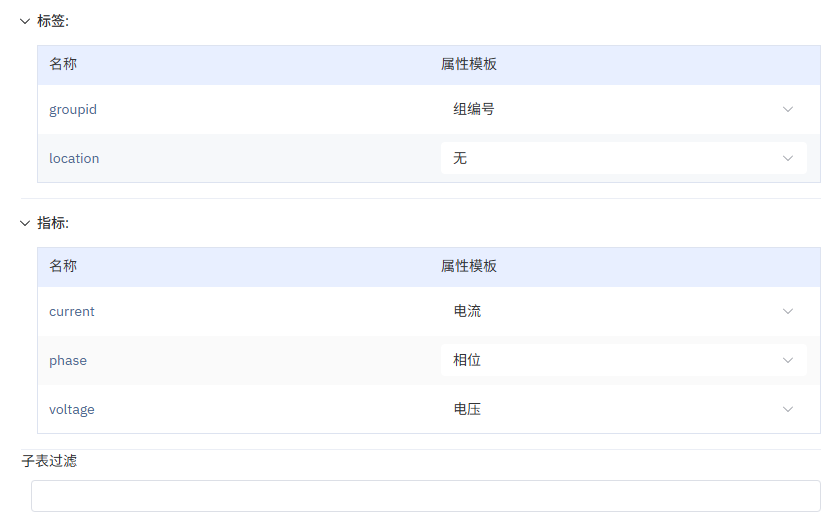 创建属性模板时,问题出现了,源表名称和 device_id 并不相同,device_id 形如:" device_001" ,子表名是 "current_meter_1"