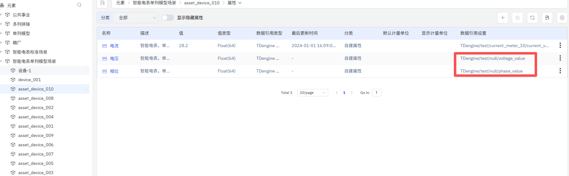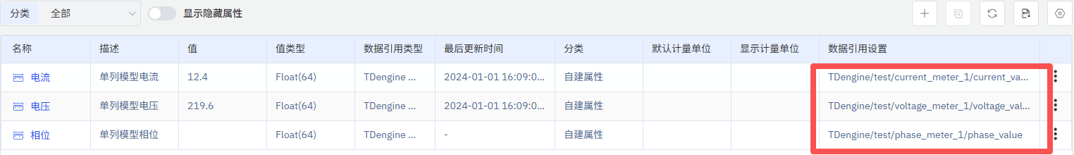 配置完成,导入数据后,结果如下,可以看到只有电流有完整的引用关系,另外两个属性引用不完整