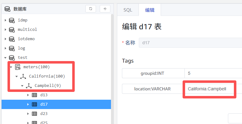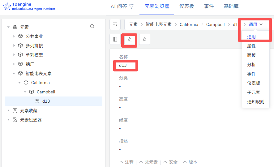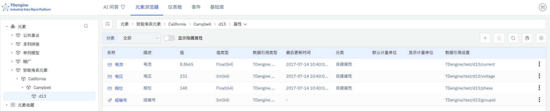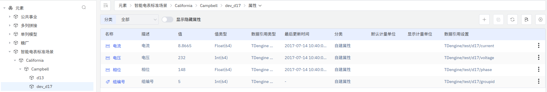 查阅 tsdb ,d17 子表也在当前 California-Campbell 路径下,用元素模板 "标准智能电表" 创建一个元素