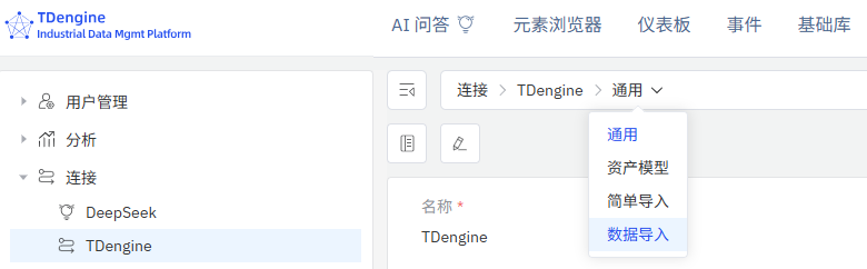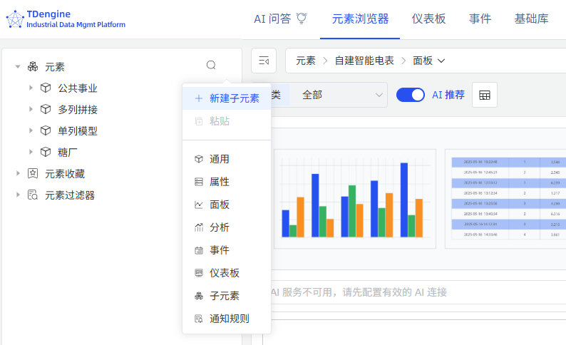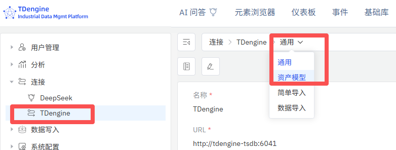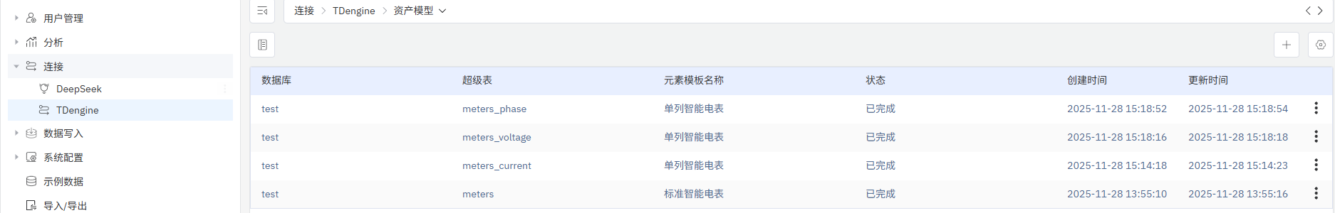 **所谓资产模型,可以理解为用元素模板创建元素的一种批量操作配置。**从管理后台-连接-TDengine 进入资产模型配置页面