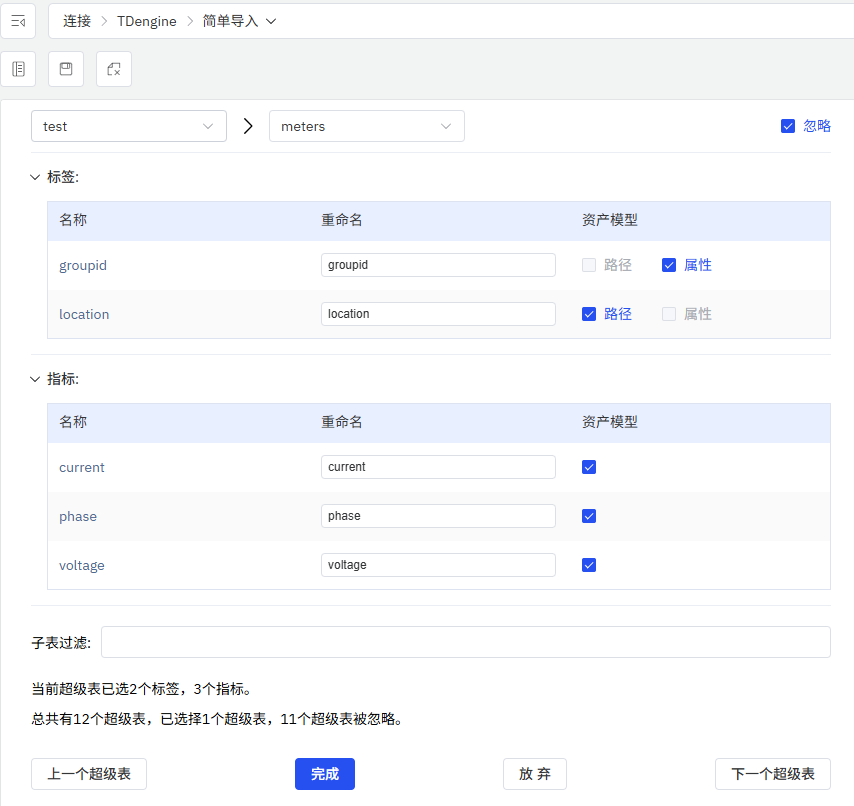 要注意到,一个资产模型只能配置一个超级表的字段引用关系,因此,当需要配置 3 个超级表的资产导入时,我们只能配置 3 次资产模型。