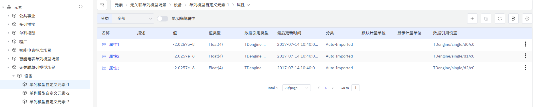 | single | meters | 单列模型自定义元素 | d3 | 单列模型自定义元素-2 | 无关联单列模型场景.设备 | c0 | 属性1 | TDengineMetric |