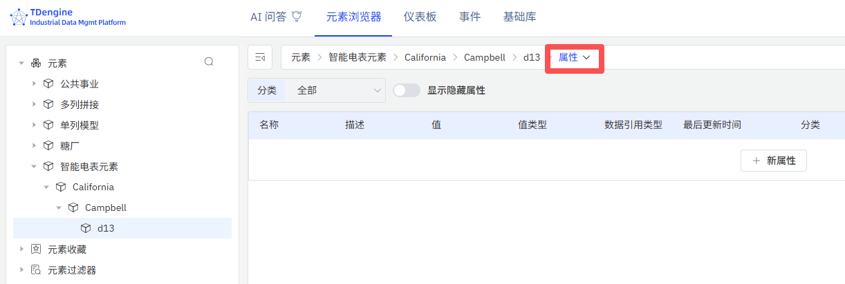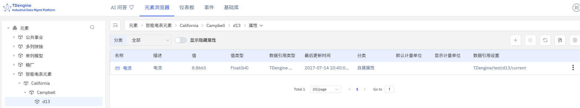 | single | meters | 单列模型自定义元素 | d0 | 单列模型自定义元素-1 | 无关联单列模型场景.设备 | c0 | 属性1 | TDengineMetric |
