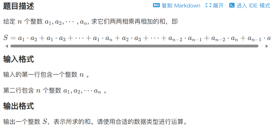 由题可见,就是想叫我们先把相邻的两个数先进行相乘再相加,我们可以很快的想到一个办法:那就是遍历这n个整数,而这n个整数又可以放在数组里面进行操作: