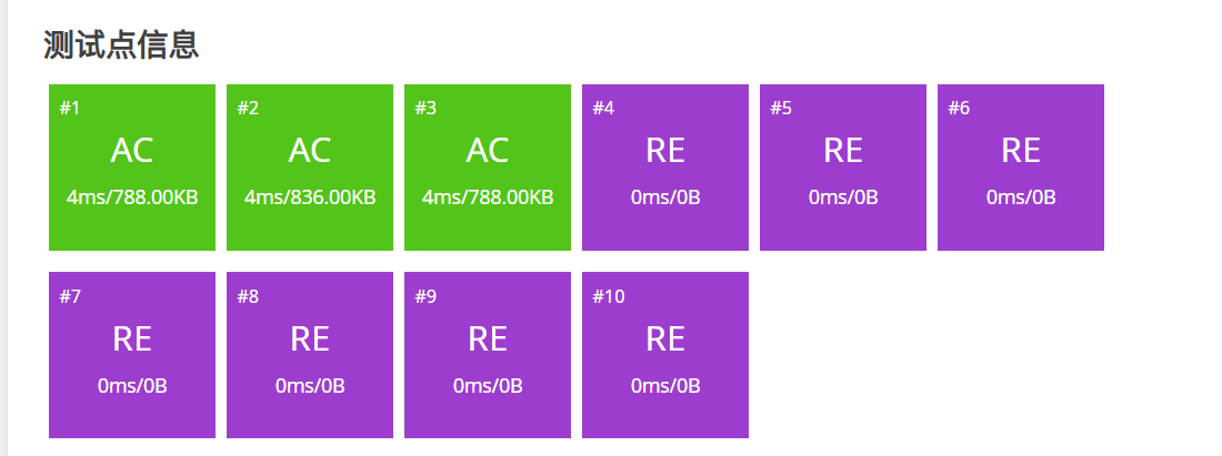可见,代码的思路没有问题,但是仅仅对了三道题而已,剩下的都是RE****, 这是为啥?那就是我们的程序的时间复杂度太高了,运行时间超时了